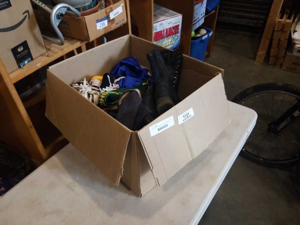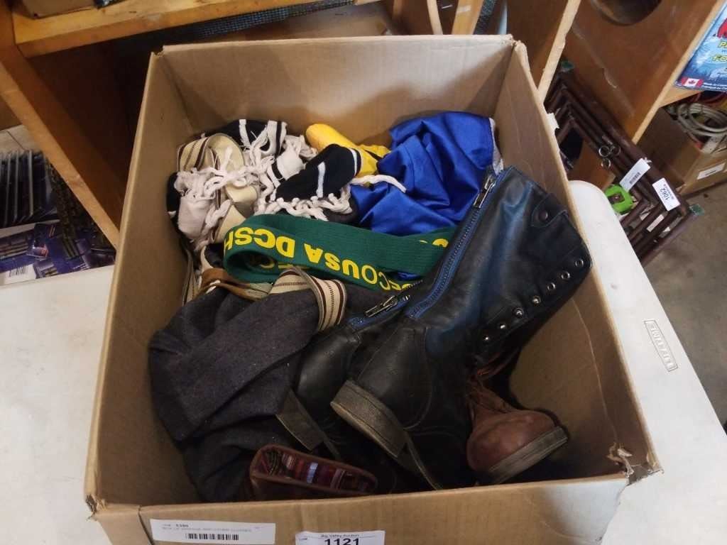BOX OF VINTAGE AND OTHER CLOTHES, ADIDAS RUNNERS
