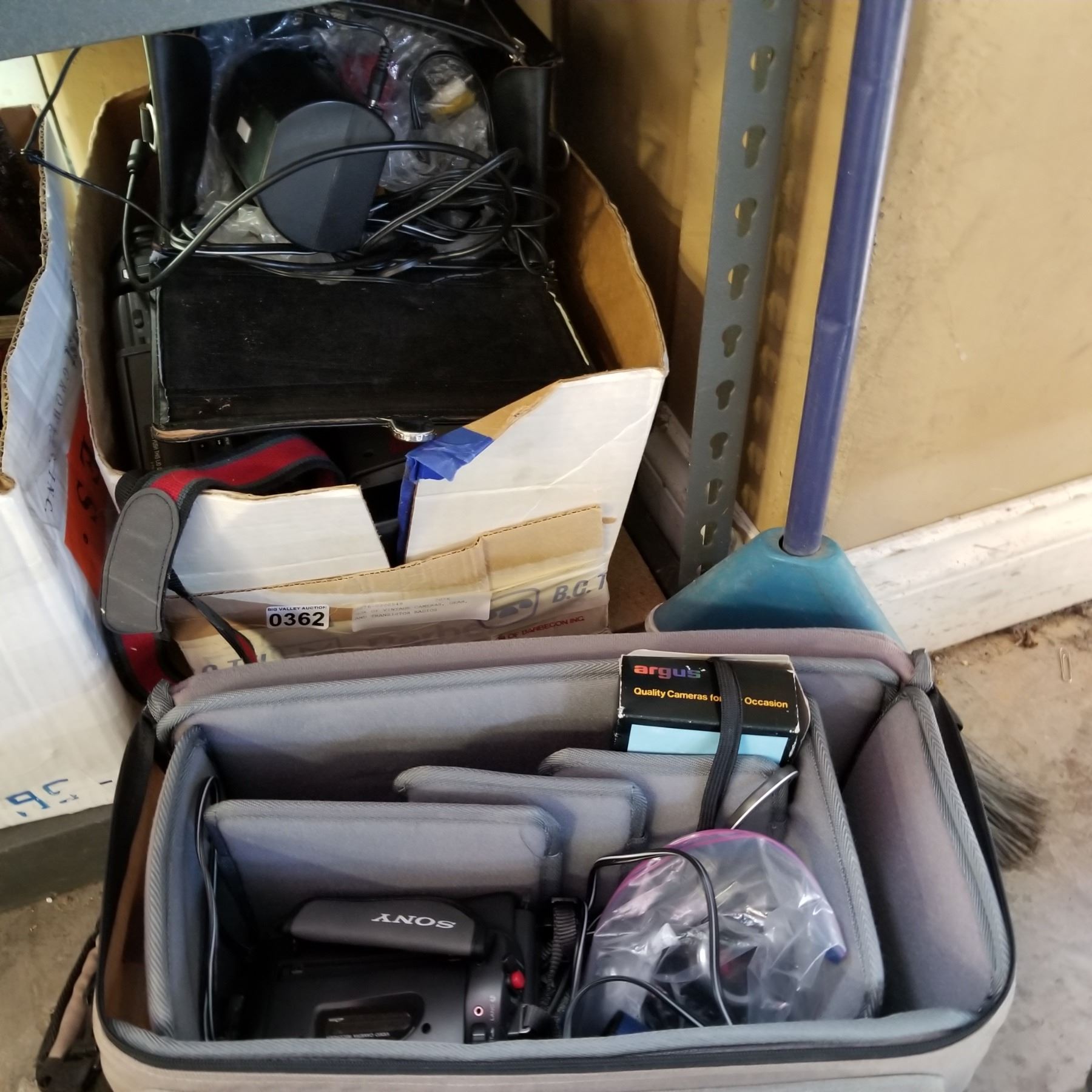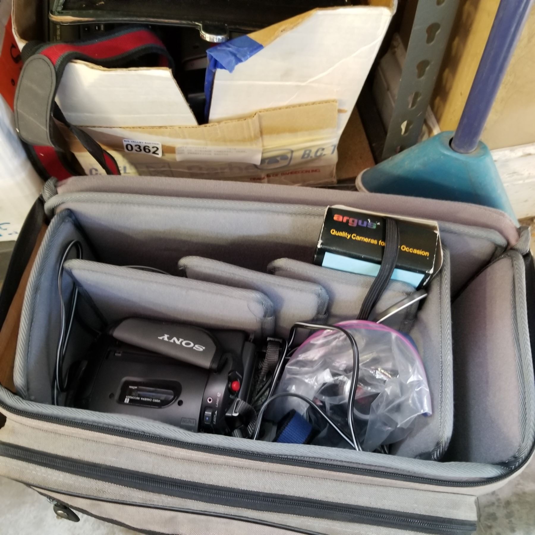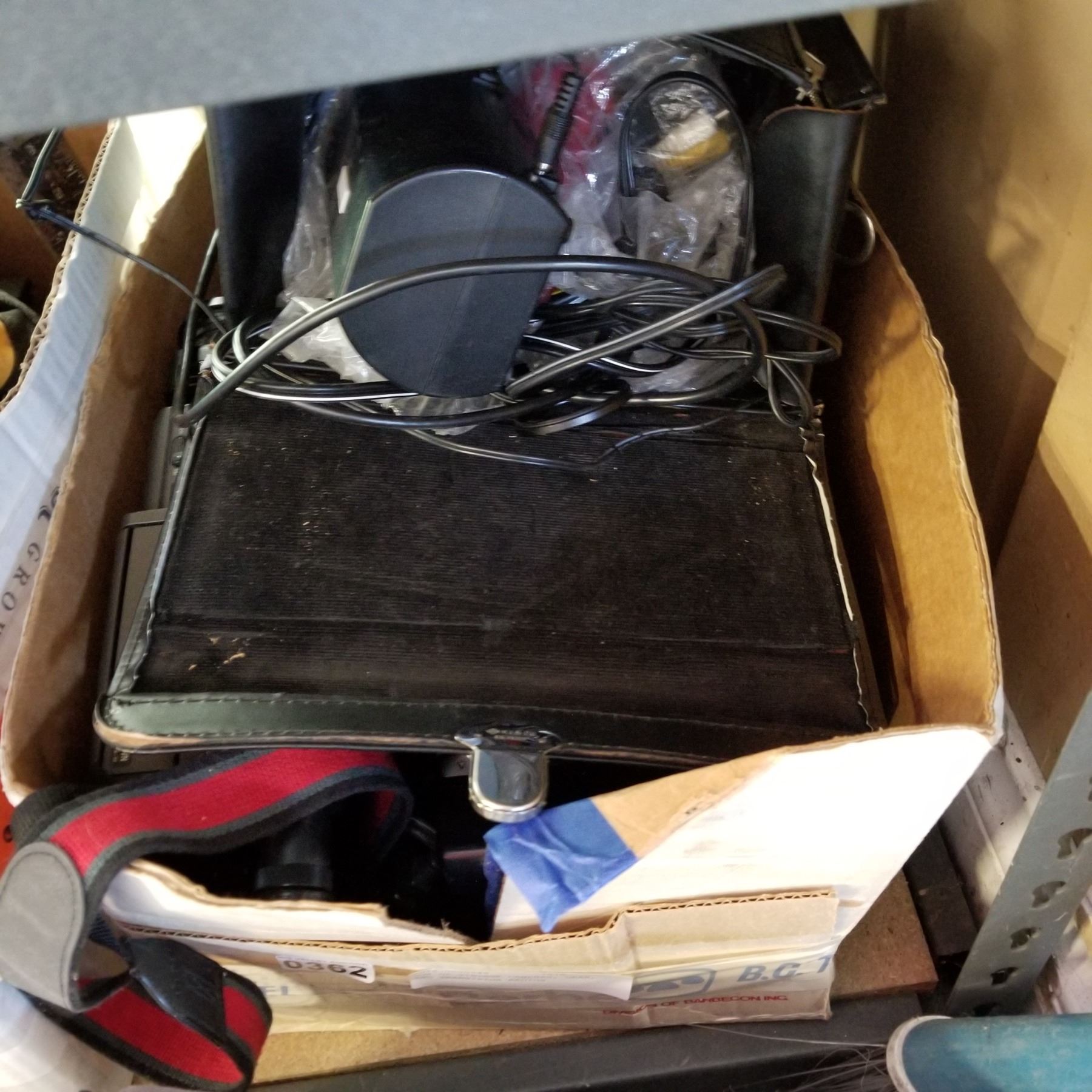 BOX OF VINTAGE CAMERAS, GEAR, AND TRANSISTOR RADIOS