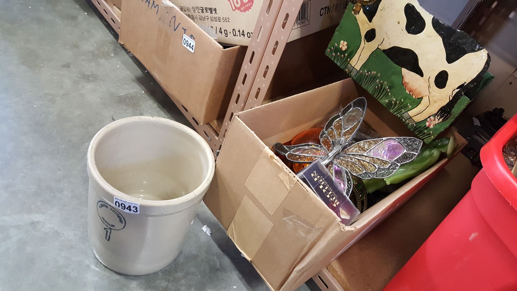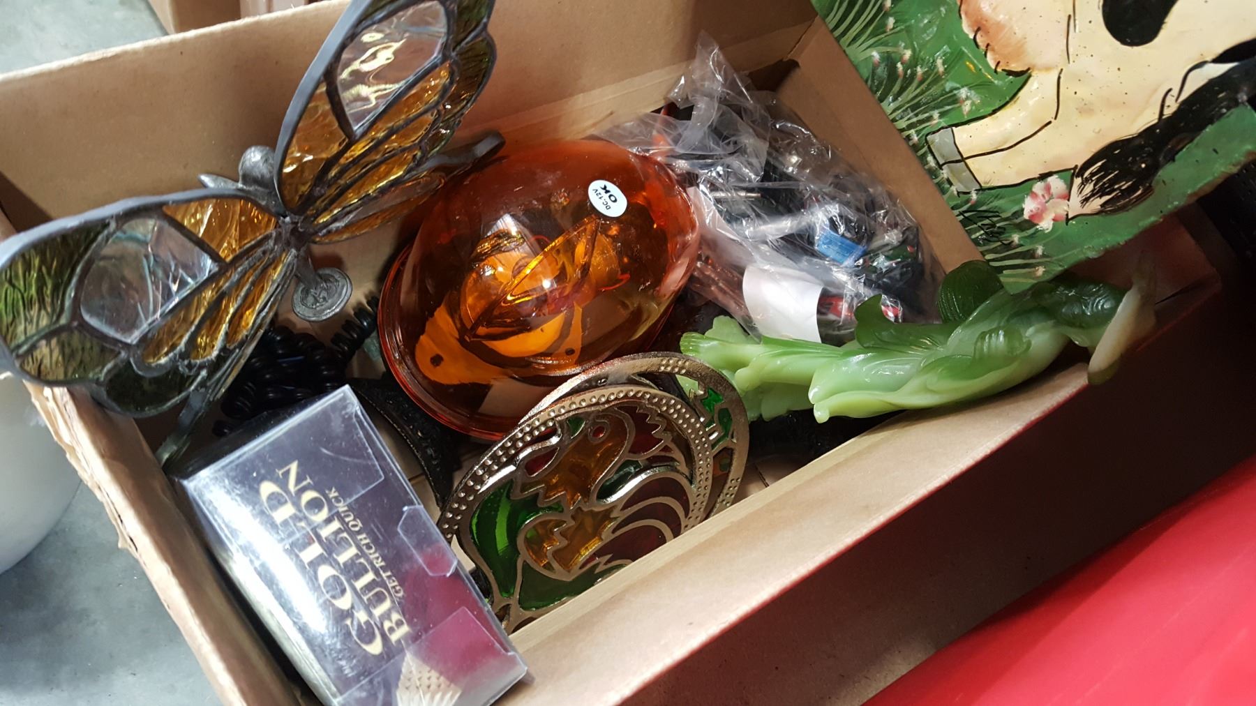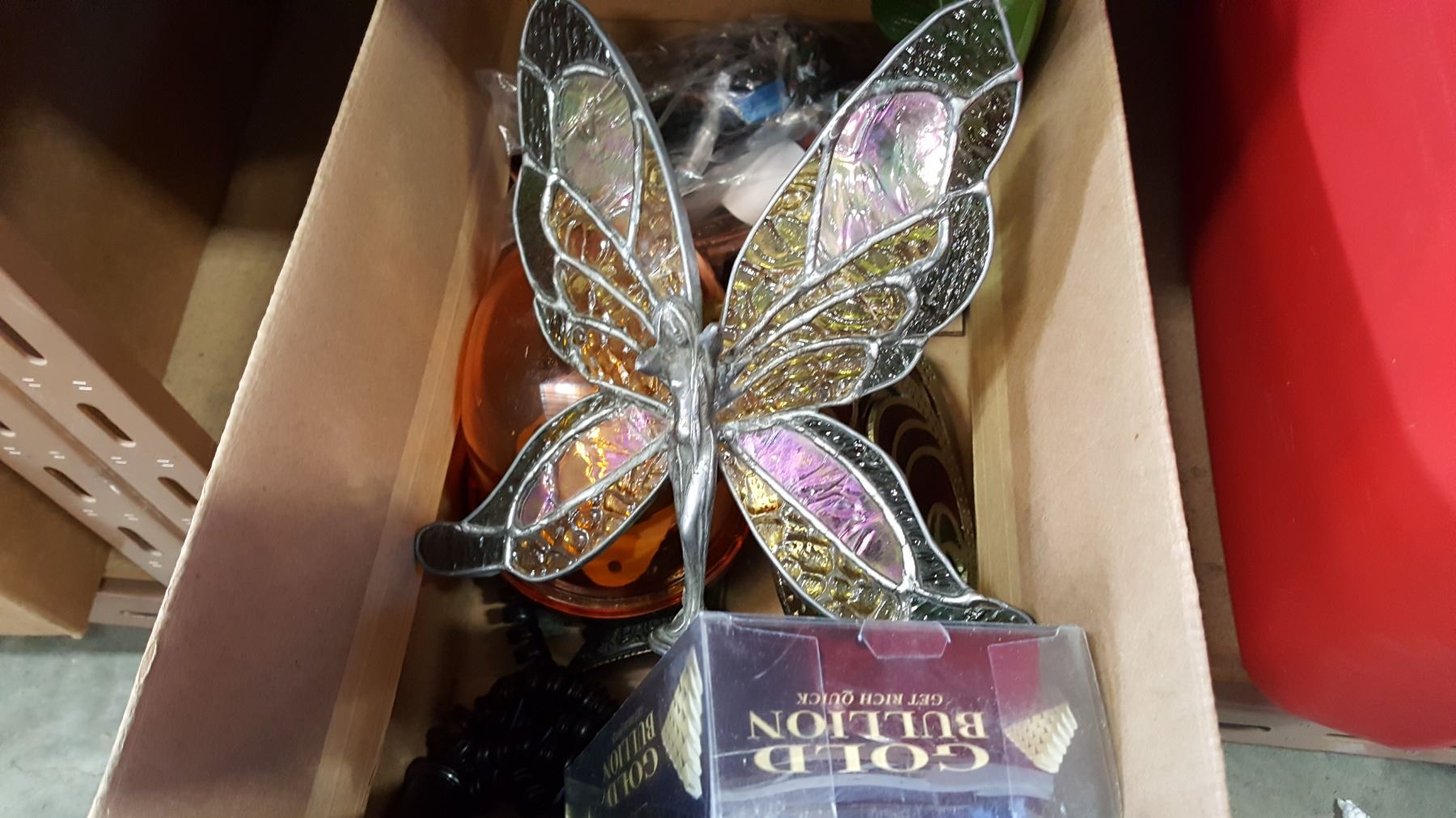 BOX OF VINTAGE COLLECTIBLES AMBER WARNING LIGHT, POTTERY CROCK, ANIMAL MAILBOX AND STAINED GLASS BUTTERFLY