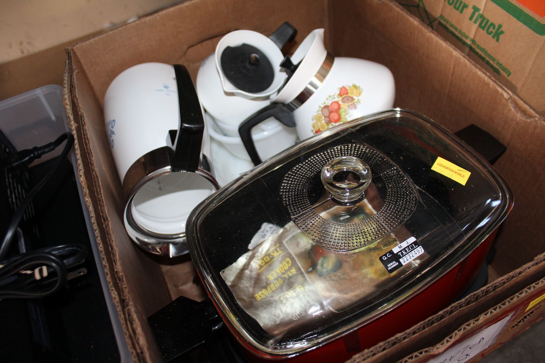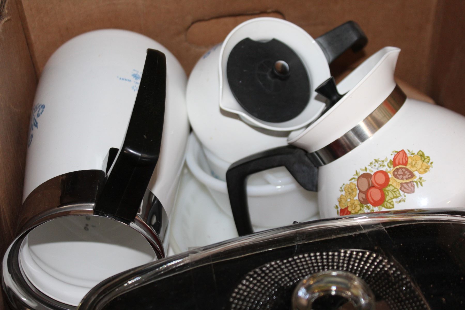 BOX OF VINTAGE CORNING WARE AND ALL PURPOSE COOKER