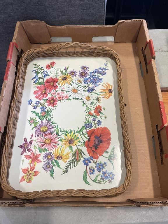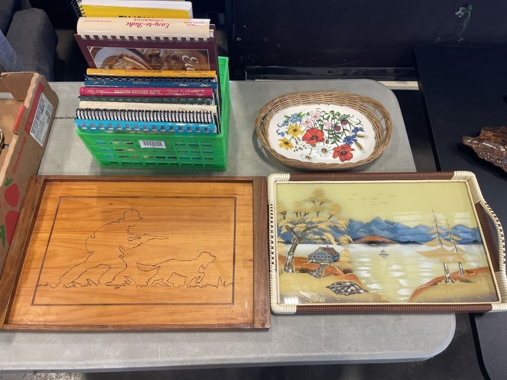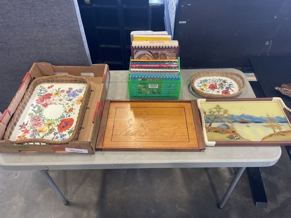 BOX OF VINTAGE SERVING TRAYS AND COOKBOOKS