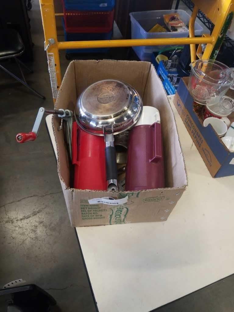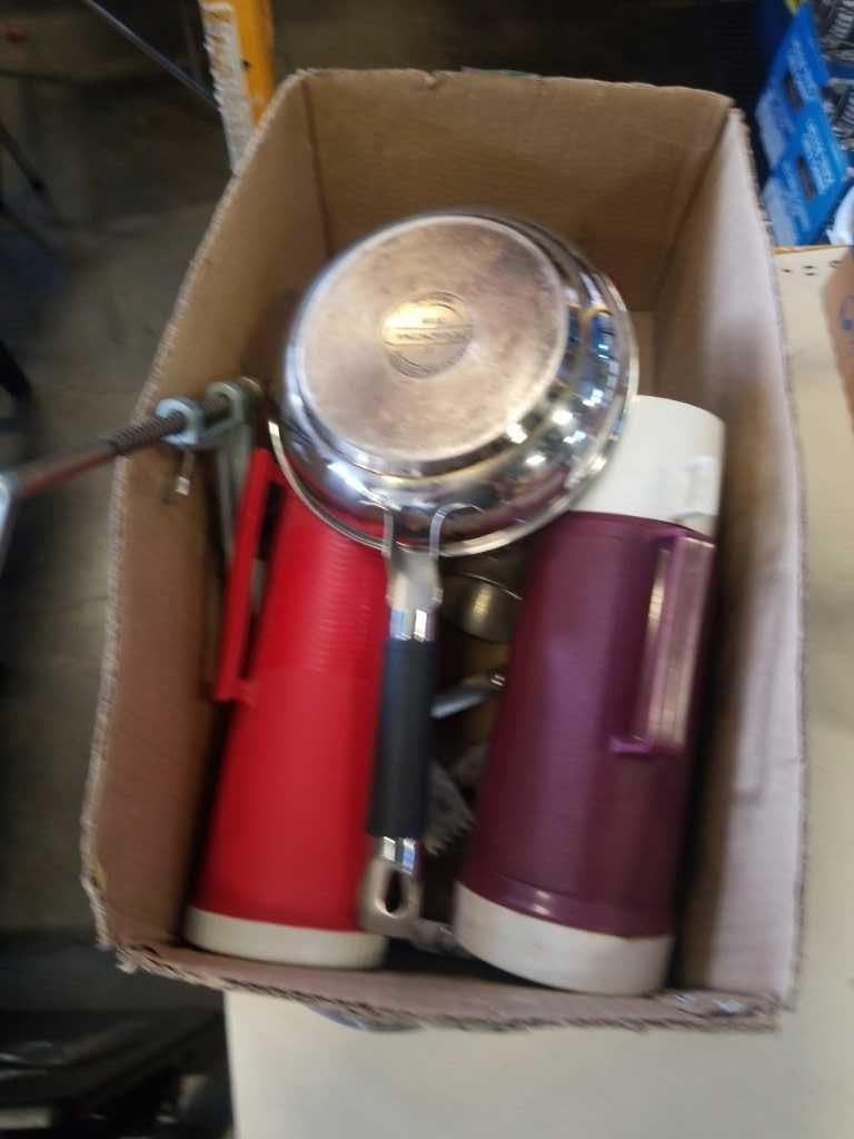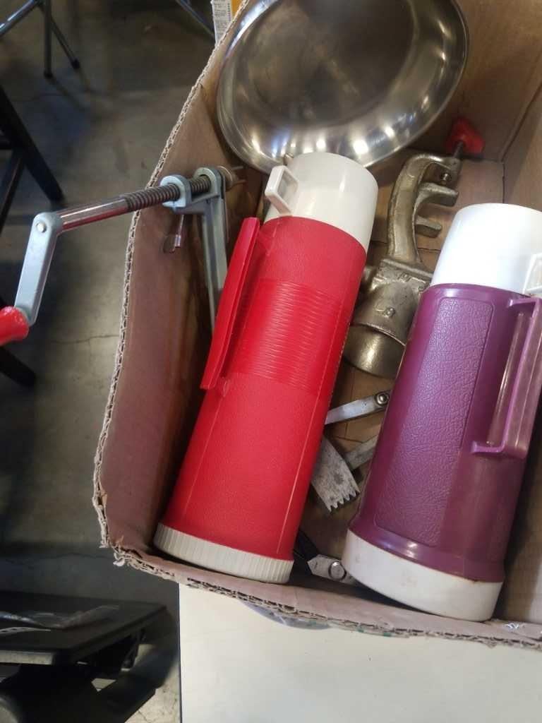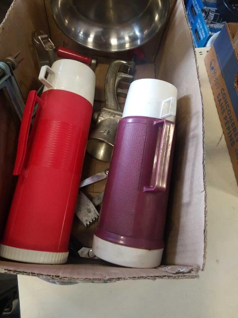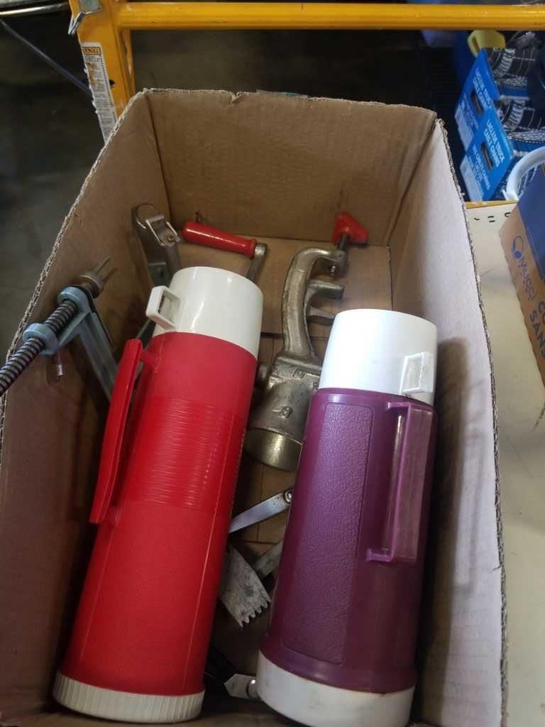 BOX OF VINTAGE THERMASES, APPLE CORER, MEAT GRINDER, ETC