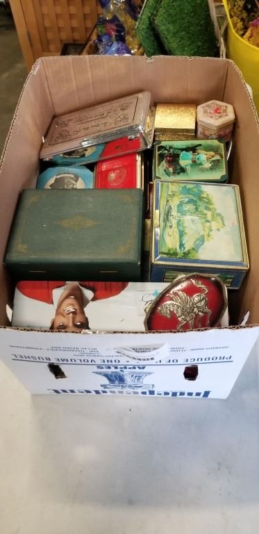 BOX OF VINTAGE TINS, BINS AND JEWELRY BOXES