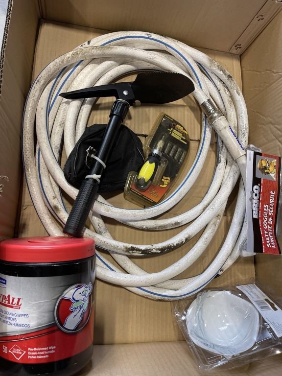 BOX OF WATER HOSE REFLECTIVE JACKET, PARTICLE MASKS EMERGENCY LIGHT AND MORE