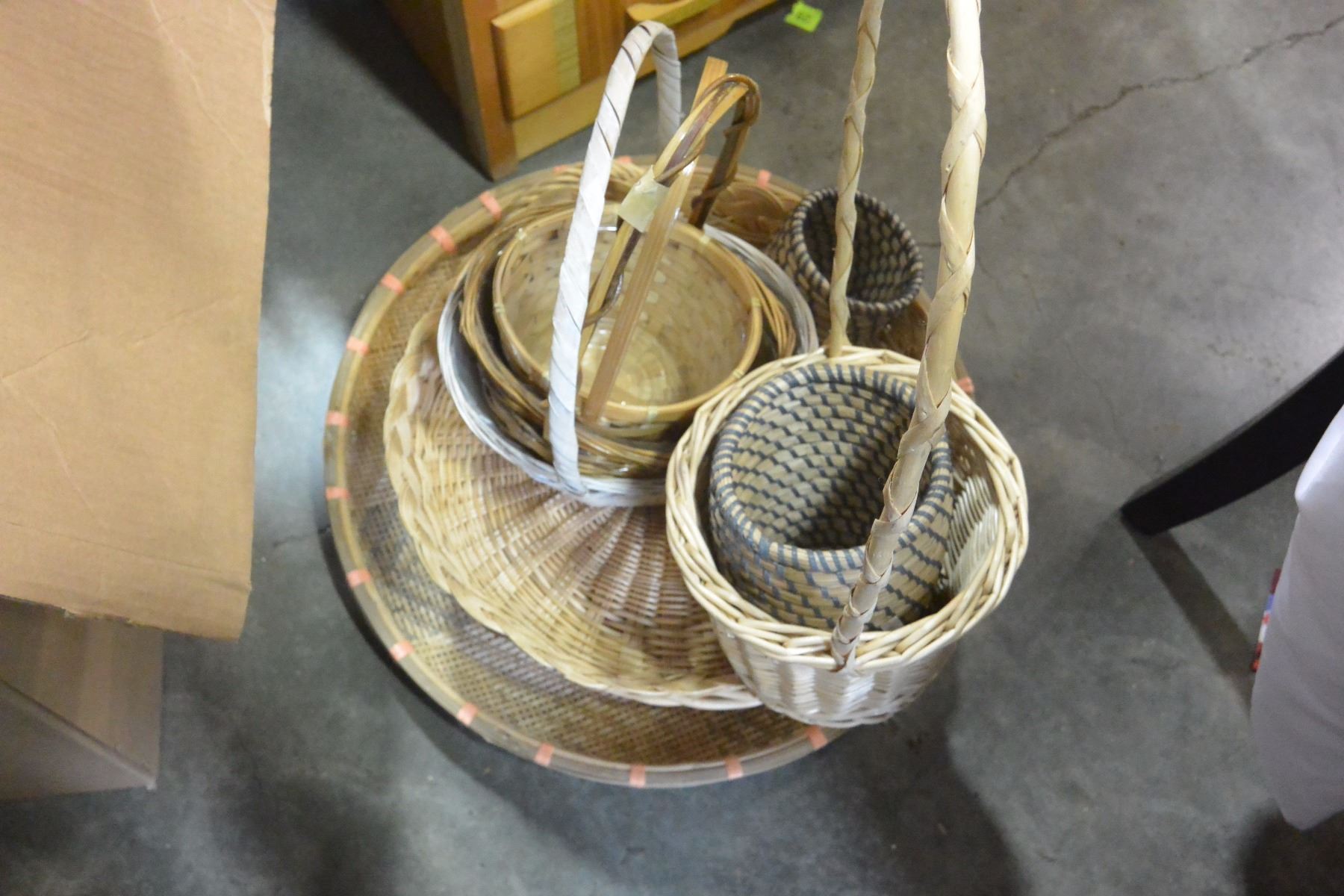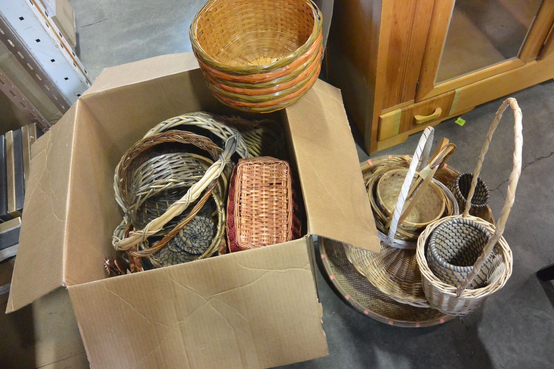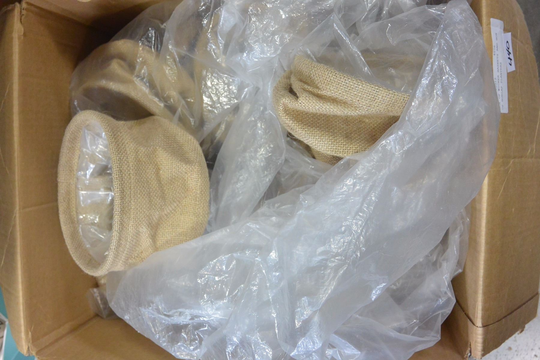 BOX OF WICKER BASKETS AND BOX OF BURLAP PLANTERS