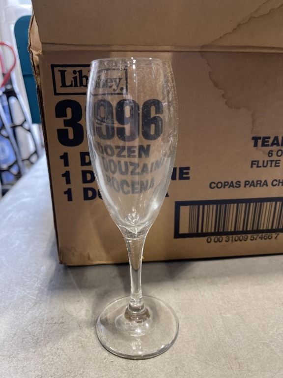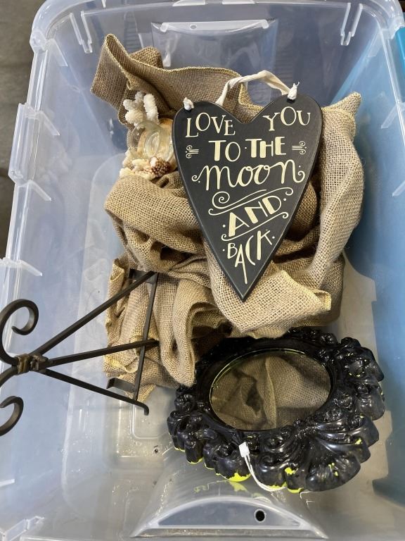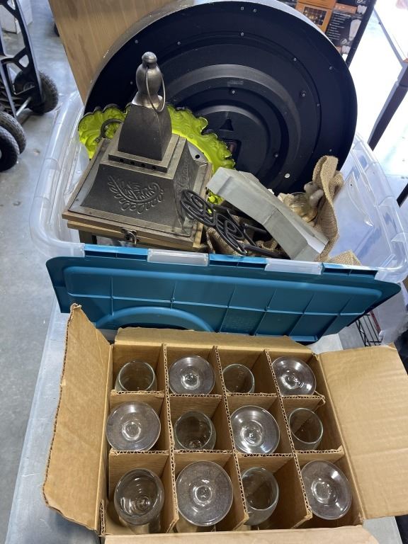 BOX OF WINE GLASSES AND TOTE OF HOUSEHOLD DECOR