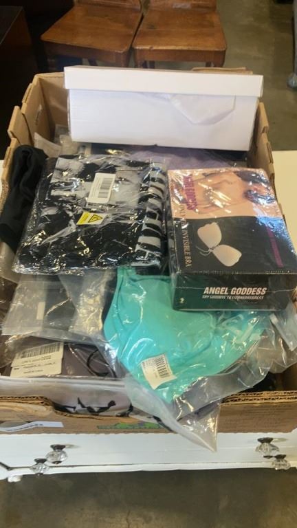 BOX OF WOMENS CLOTHING AND ACCESSORIES, NAIL ART, SIZE 10 WOMENS FLATS, MEDIUM NIRVANA SHIRT