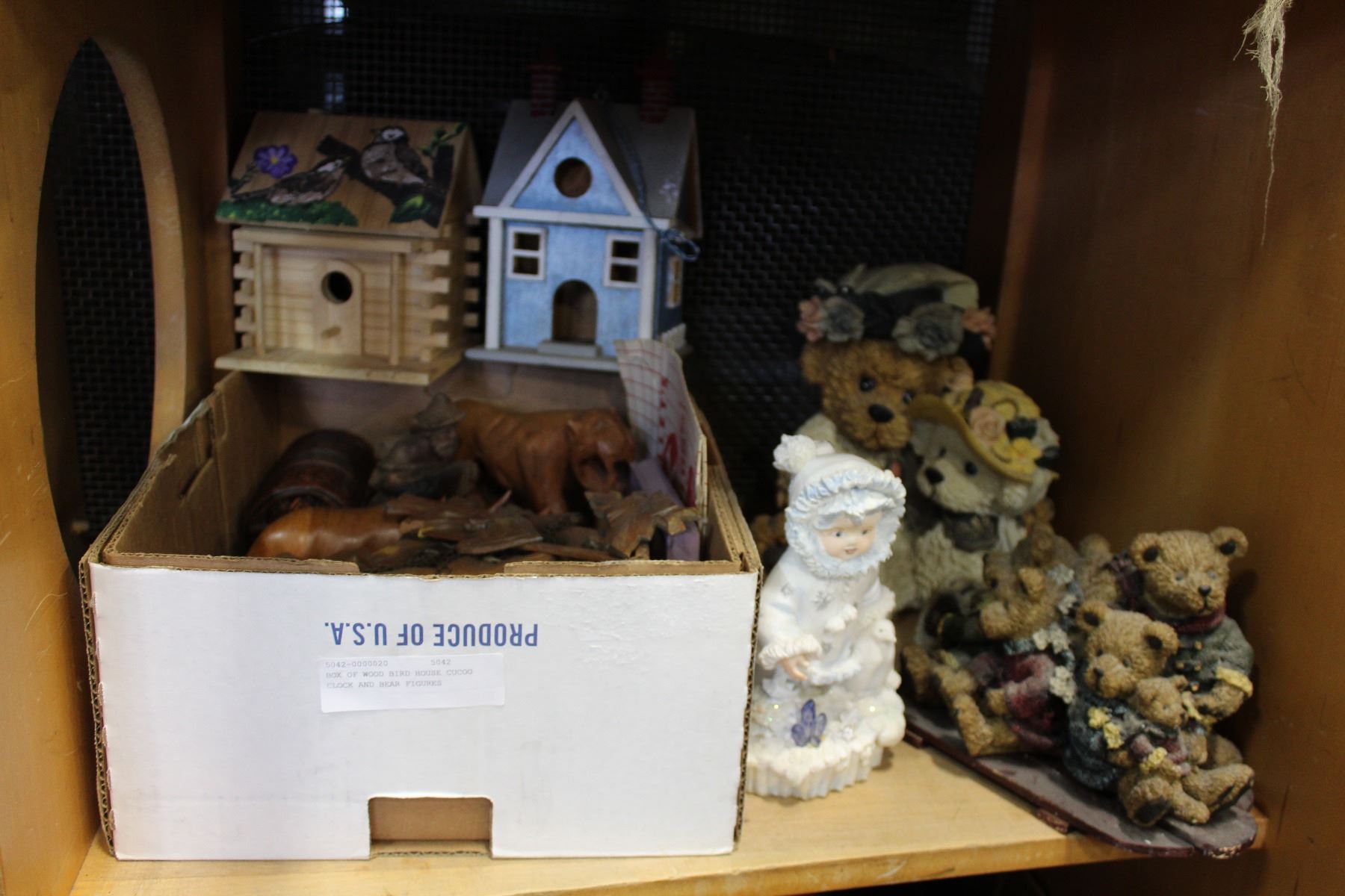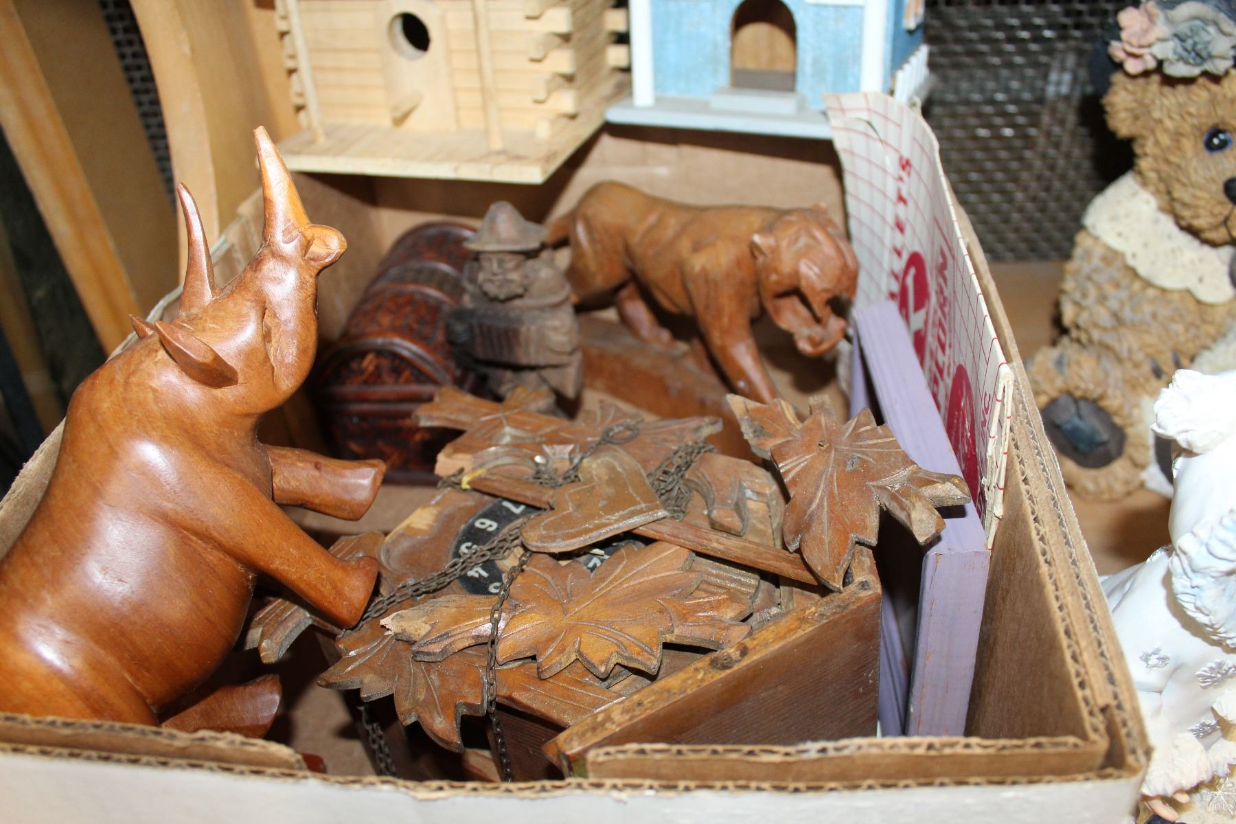 BOX OF WOOD BIRD HOUSE CUCOO CLOCK AND BEAR FIGURES