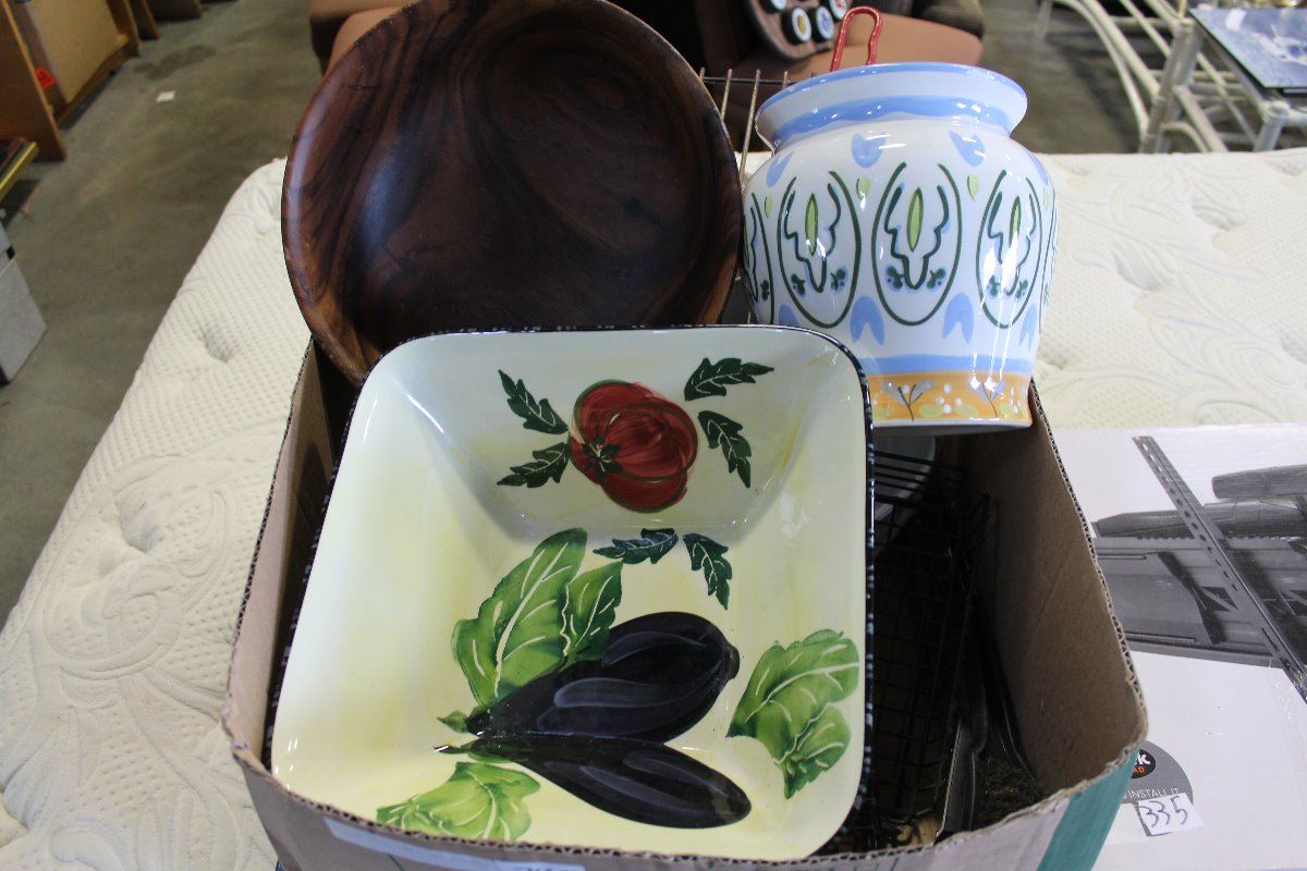 BOX OF WOOD BOWLS AND KITCHEN ITEMS