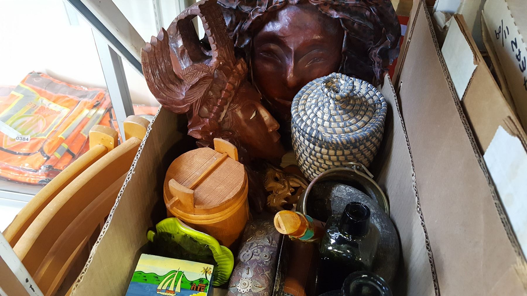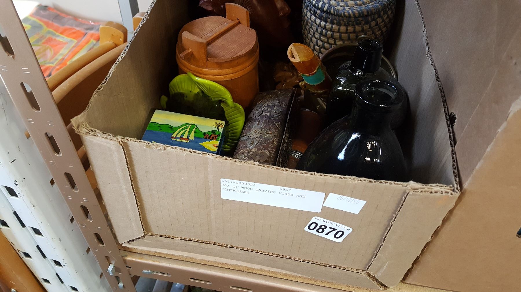 BOX OF WOOD CARVING HORNS AND CONTAINERS