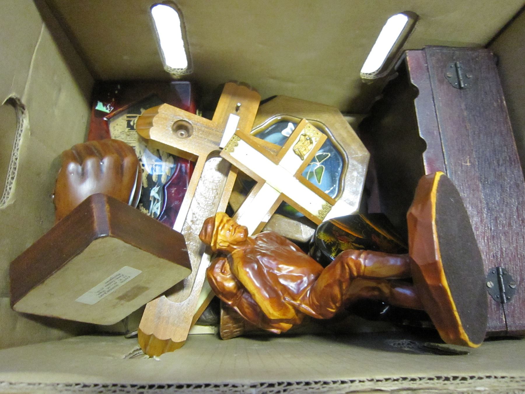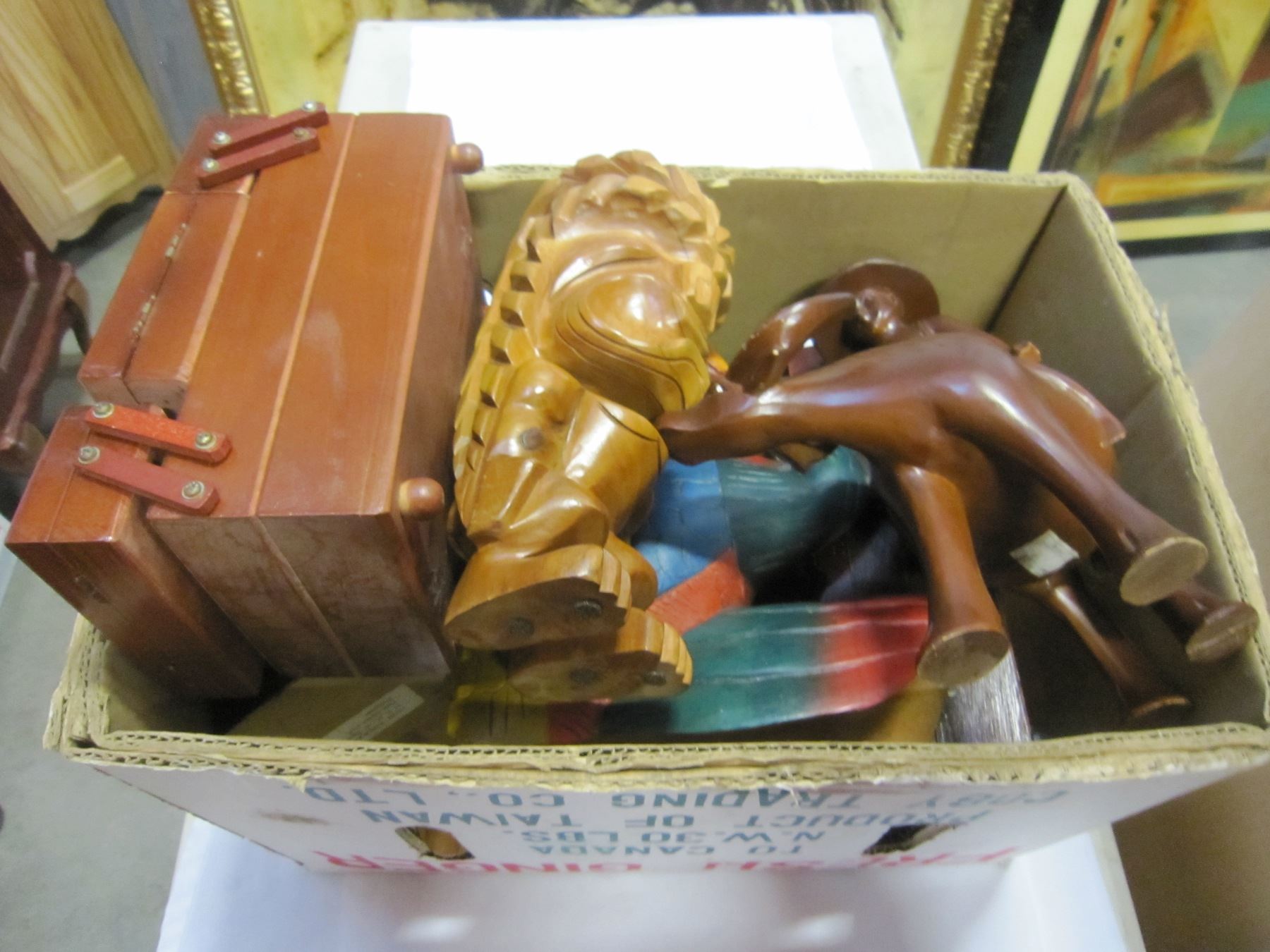 BOX OF WOOD CARVINGS, BOXES, AND WATER BUFFALO