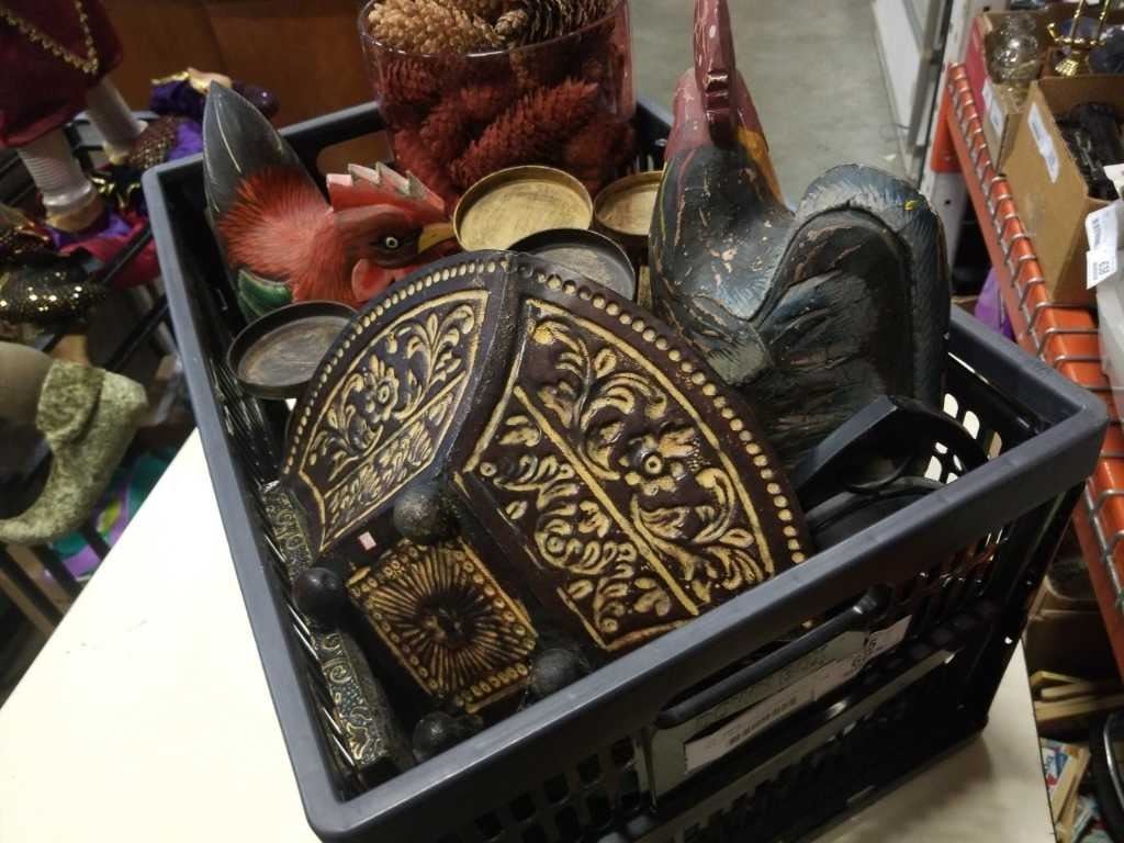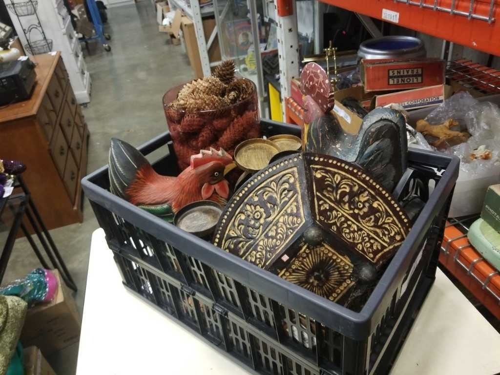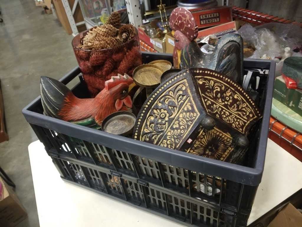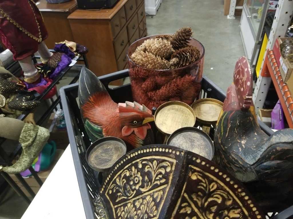 BOX OF WOOD CHICKENS AND CANDLE HOLDERS