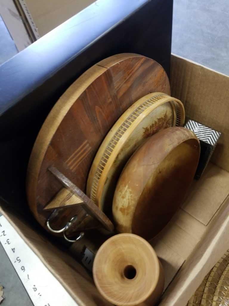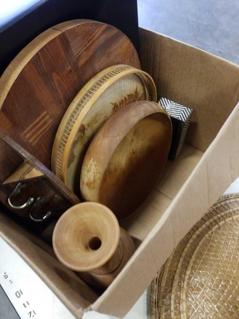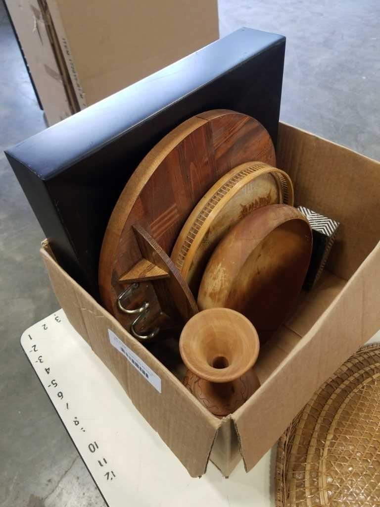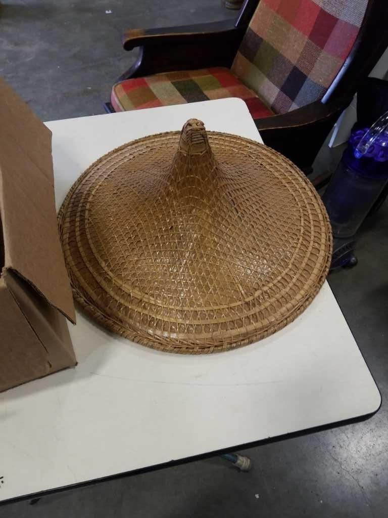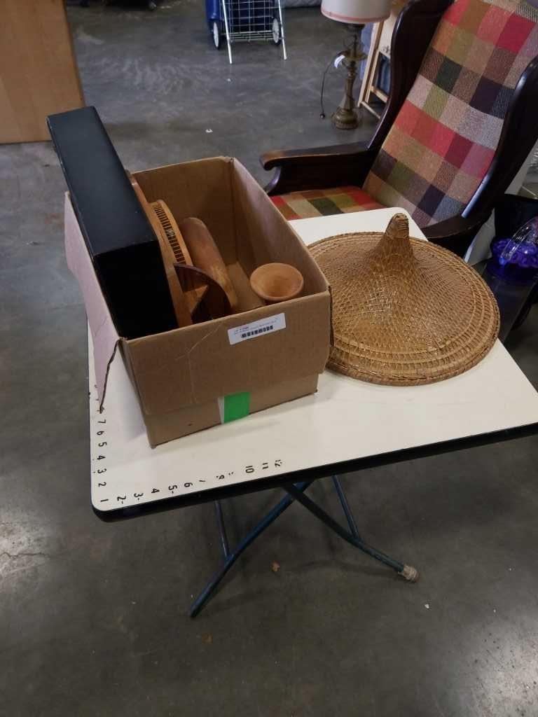 BOX OF WOOD COLLECTIBLES AND FIELD PICKERS WICKER HAT AND MORE