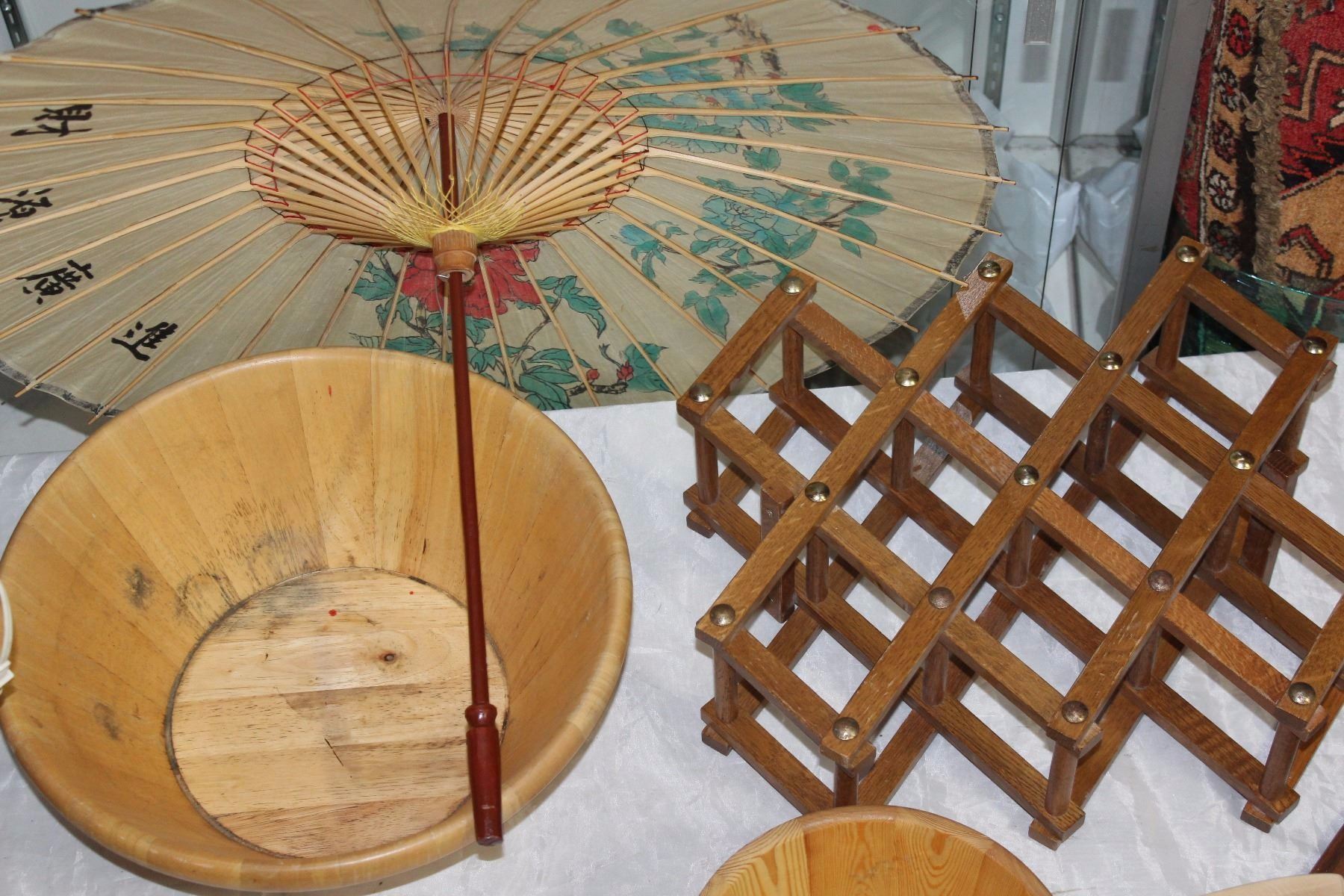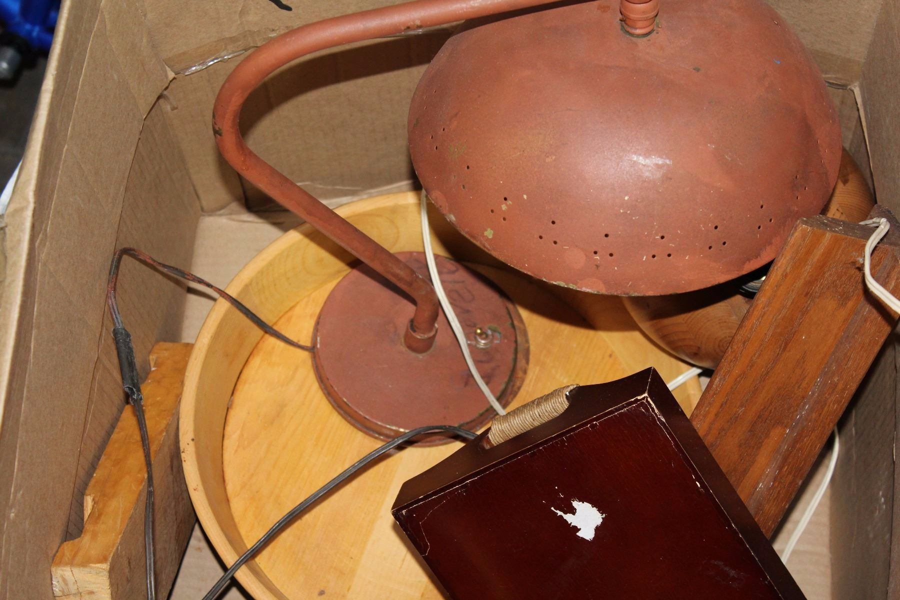 BOX OF WOOD DECORATIONS AND METAL LAMP