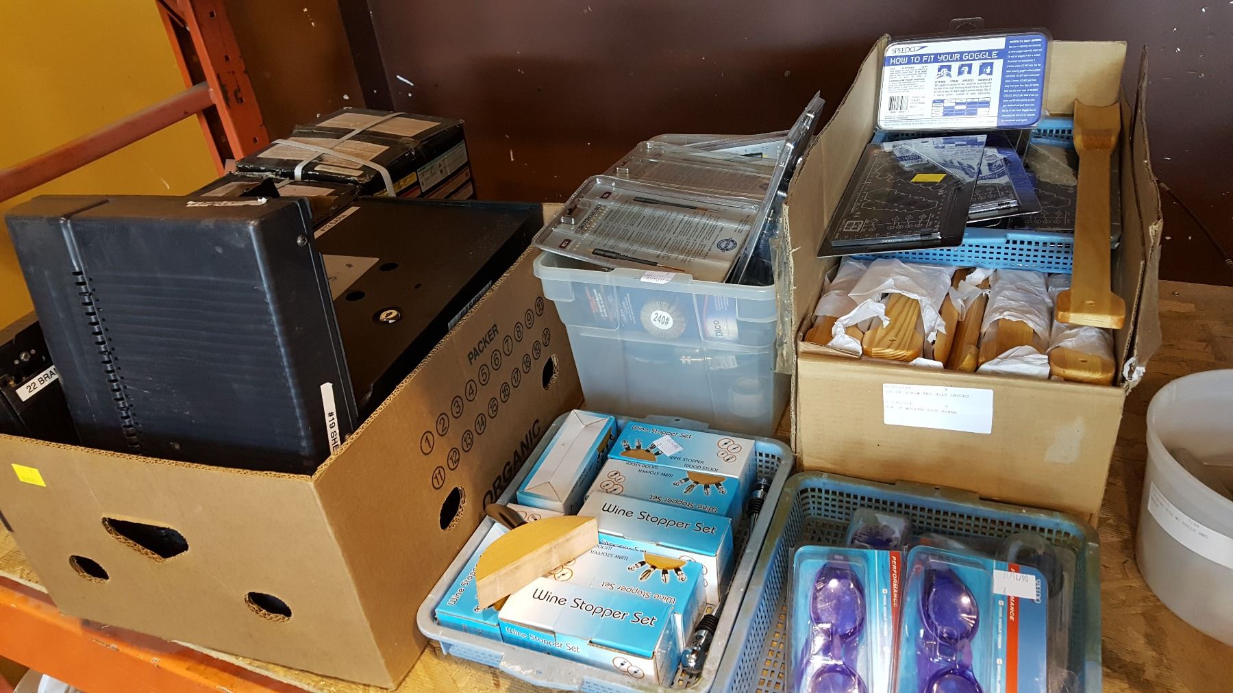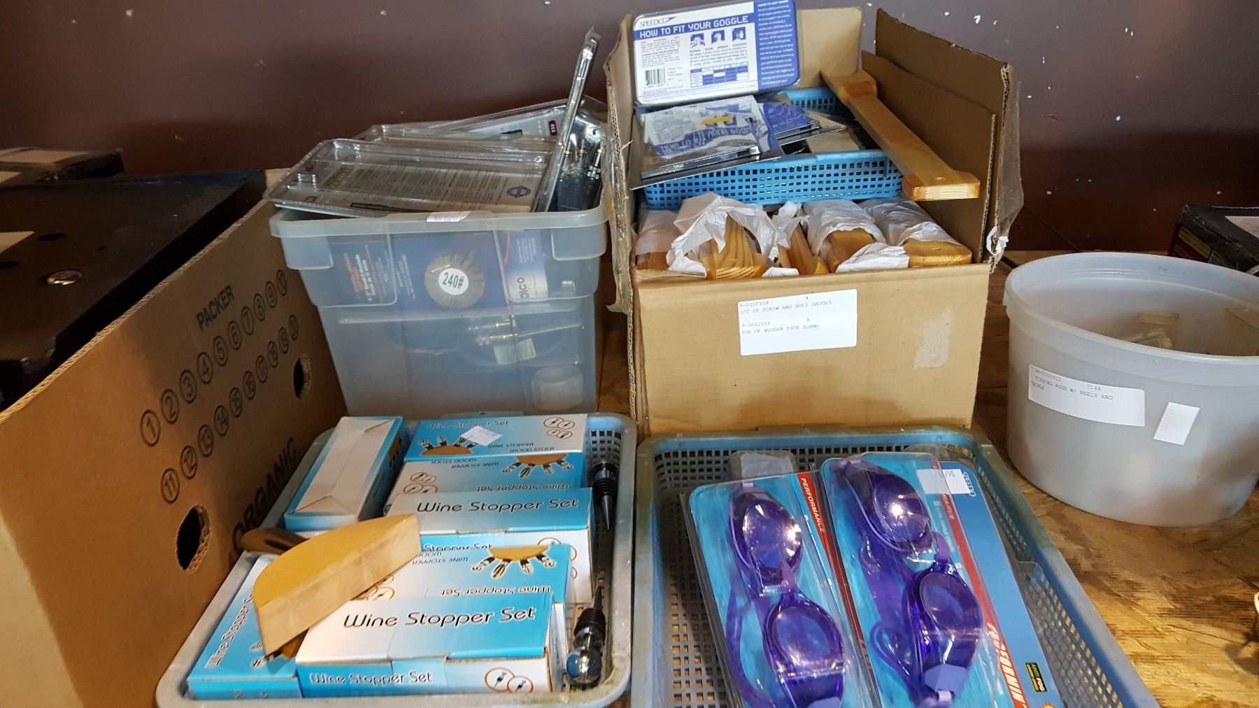 BOX OF WOODEN SHOE HORNS SCREW AND BOLT GAUGES AND SWIM GOGGLES