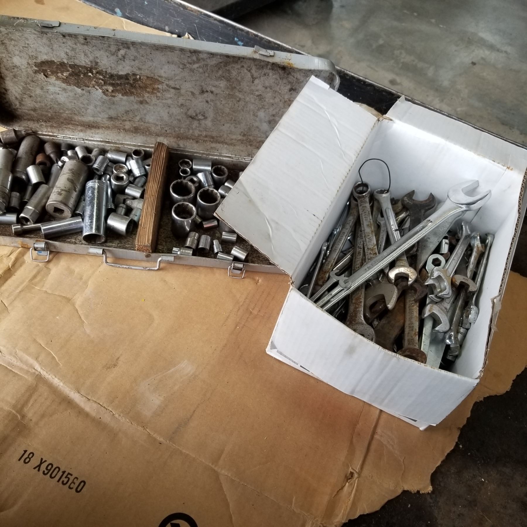BOX OF WRENCHES AND METAL CASE W/ SOCKETS