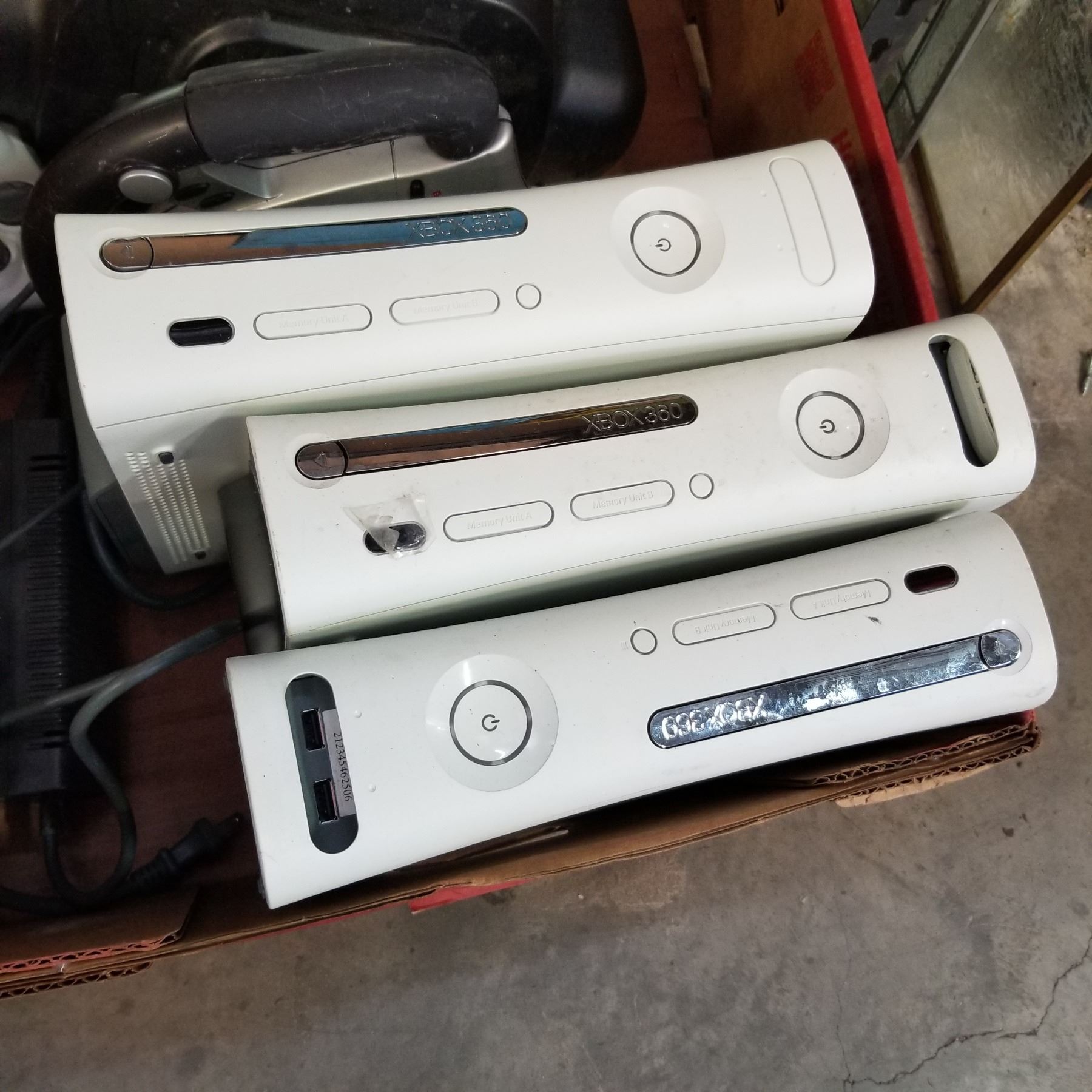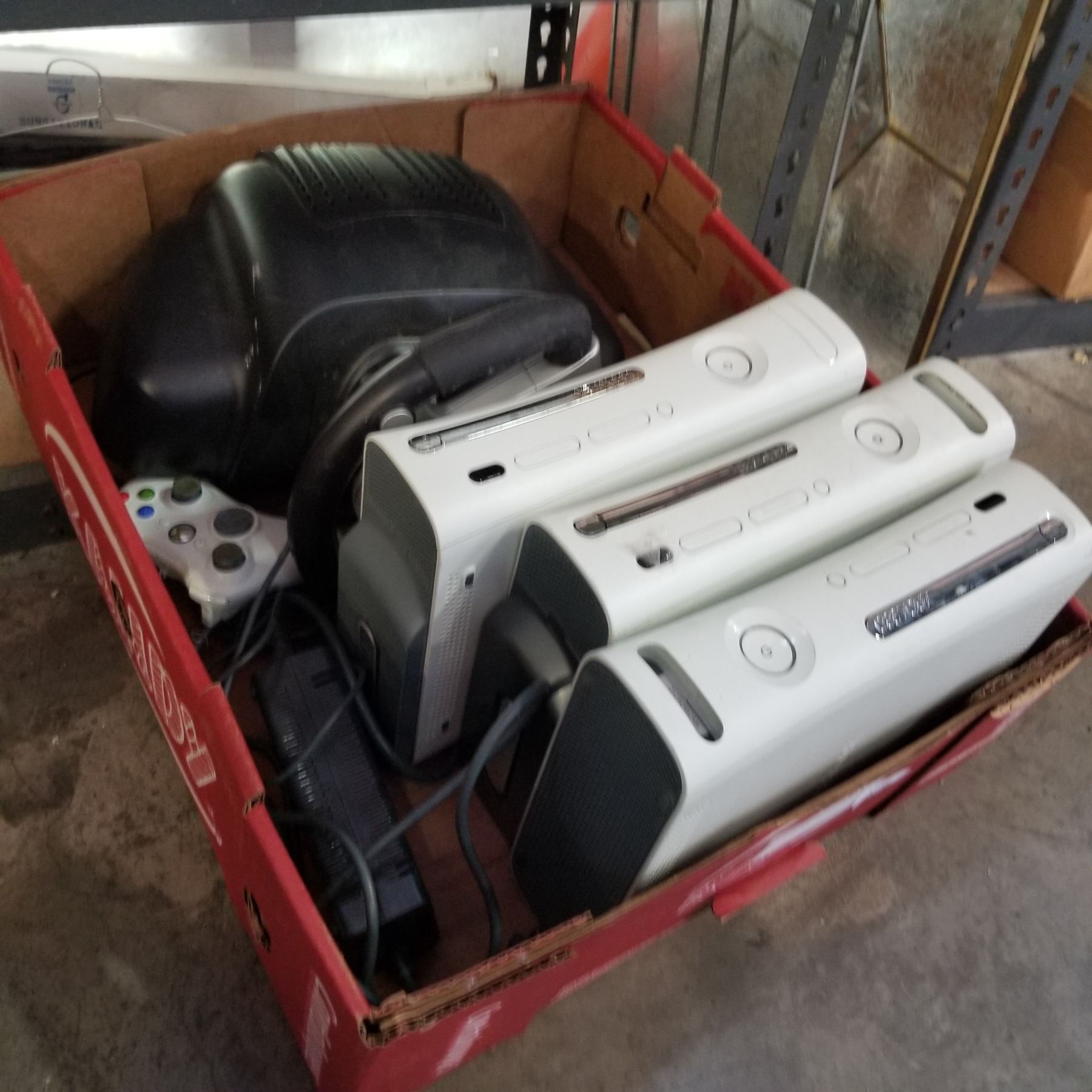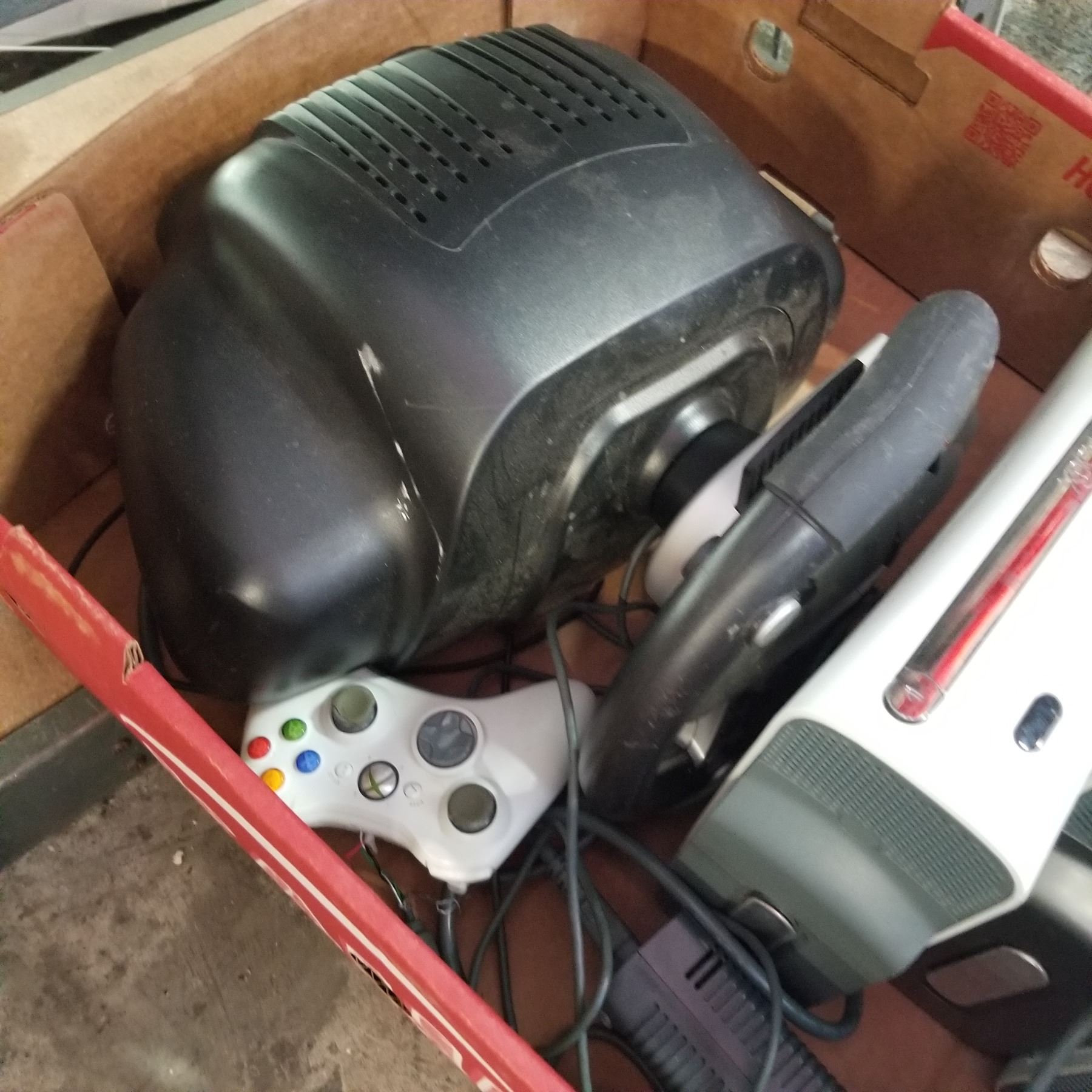 BOX OF X-BOX 360 CONSOLES AND RACING WHEEL