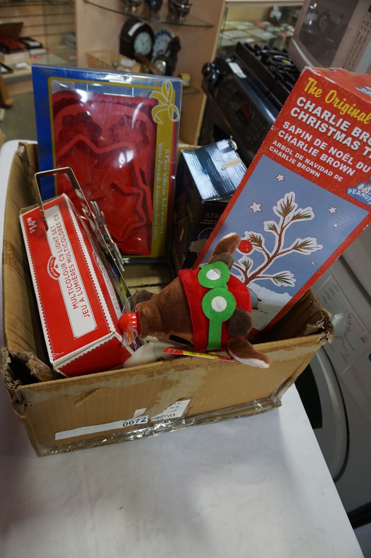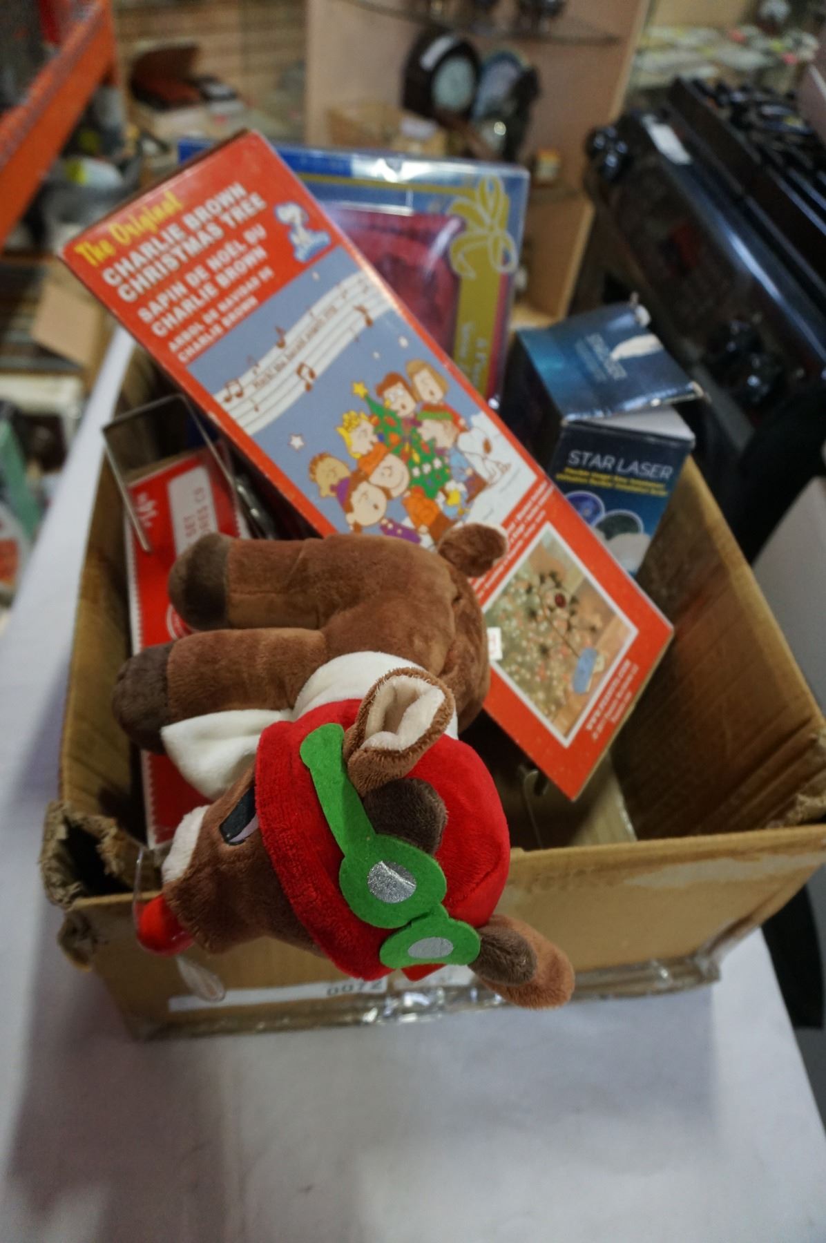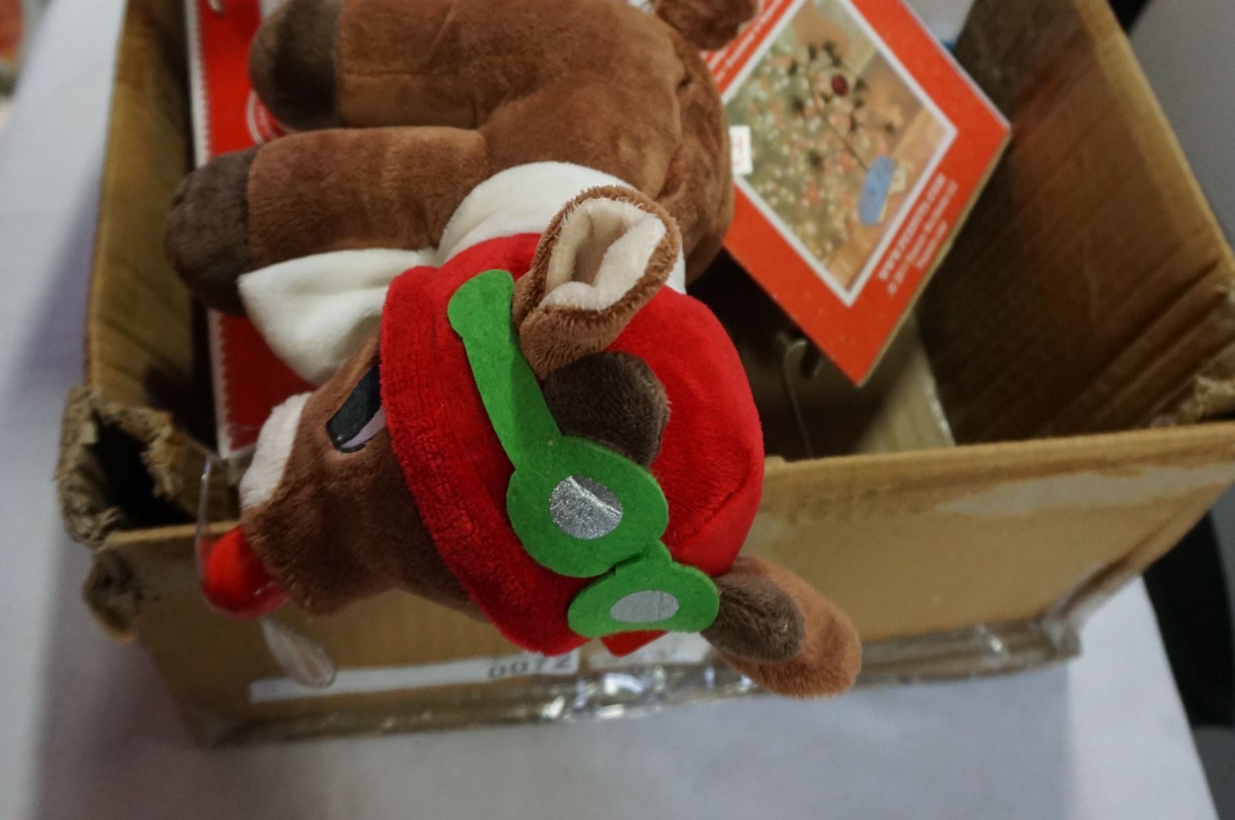 BOX OF XMAS DECOR AND RUDOLPH TOY