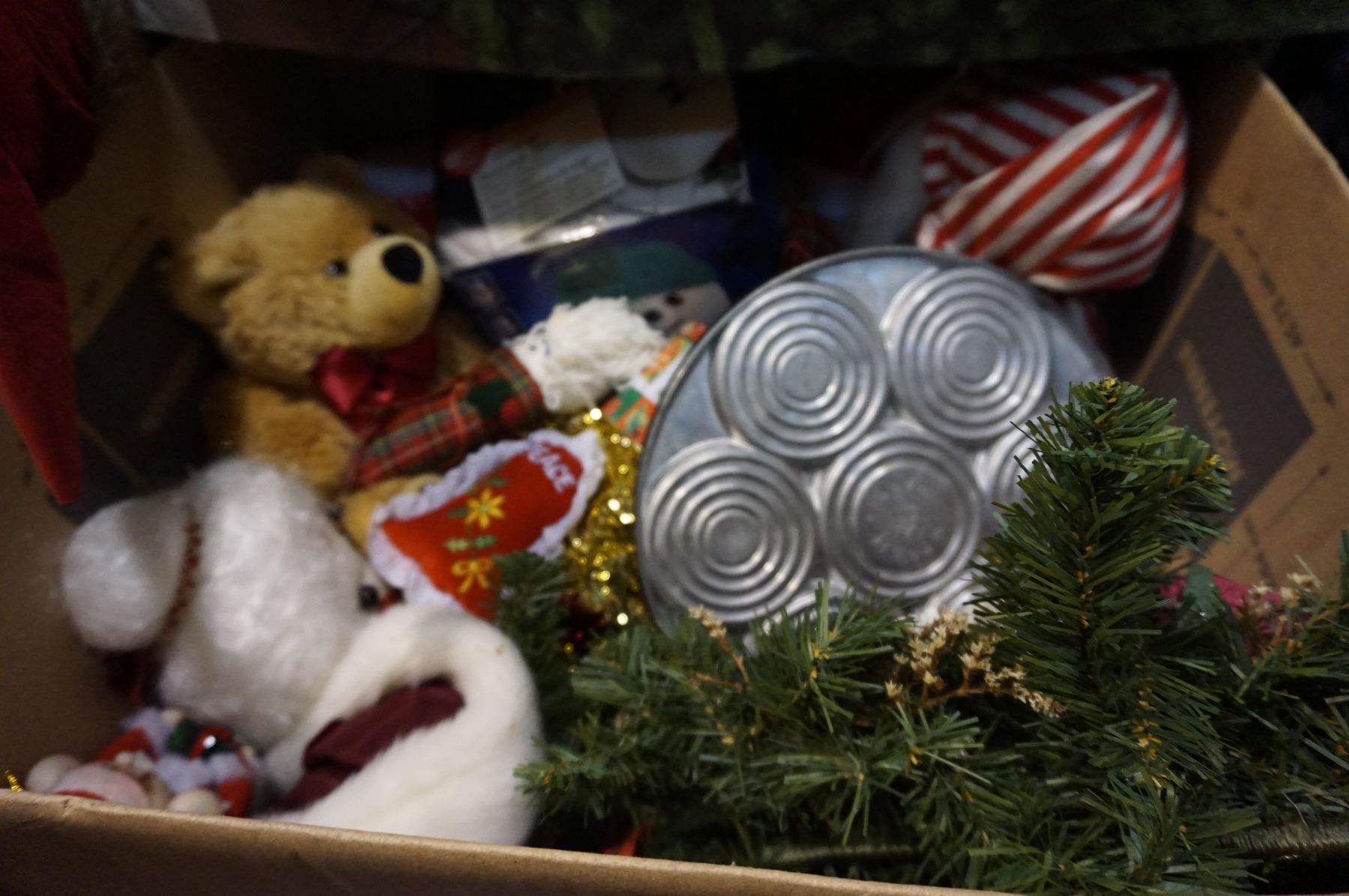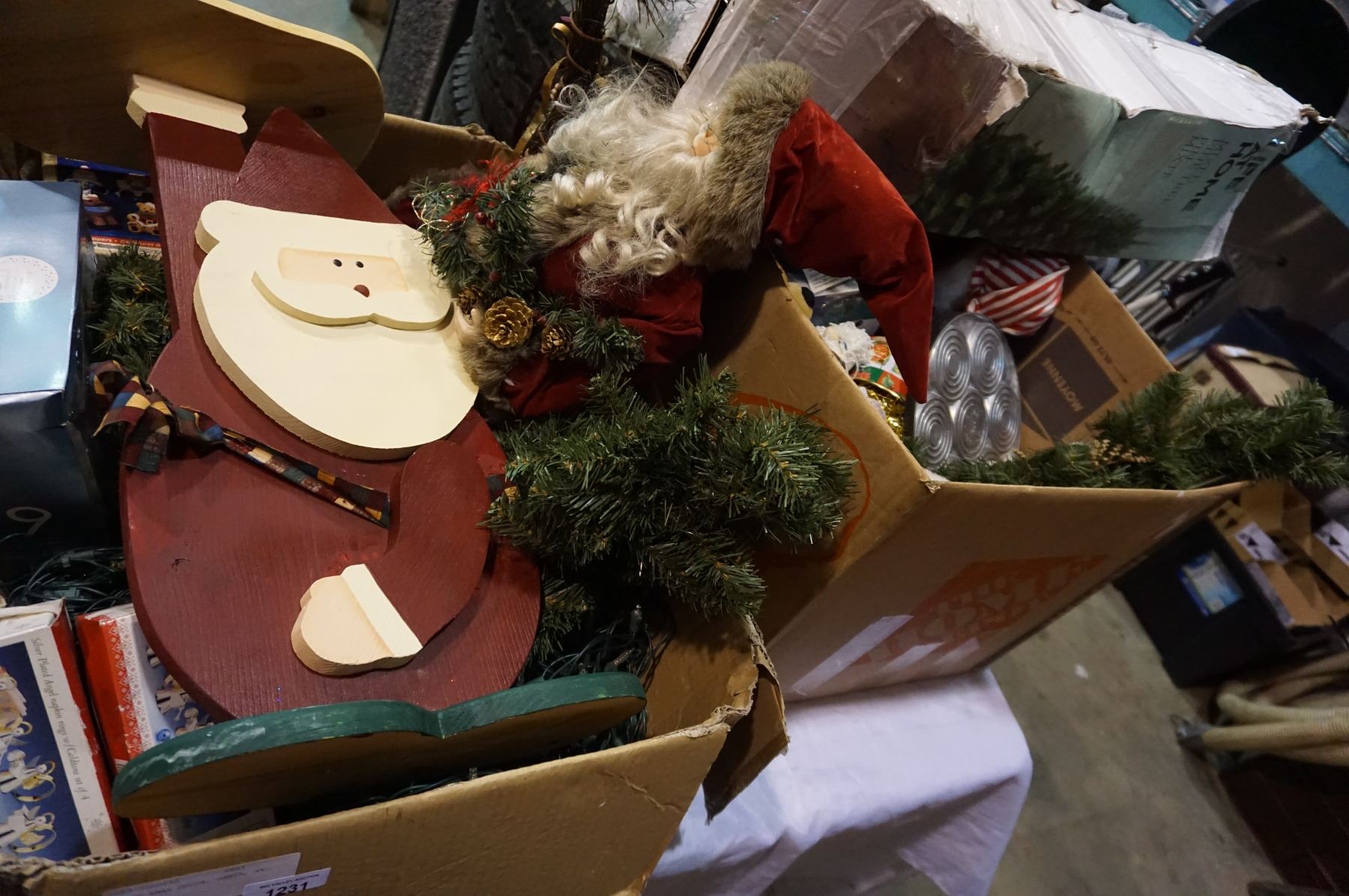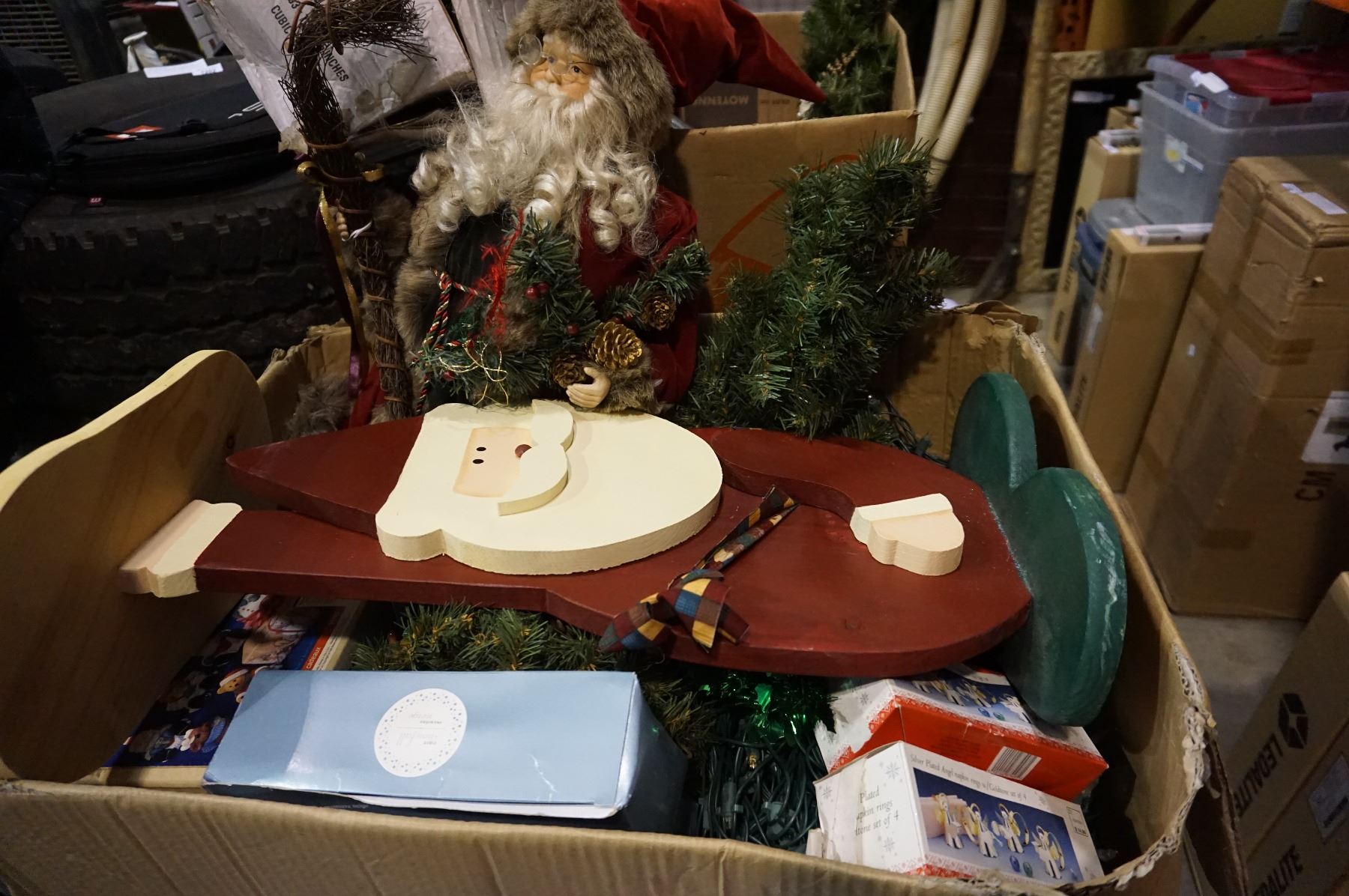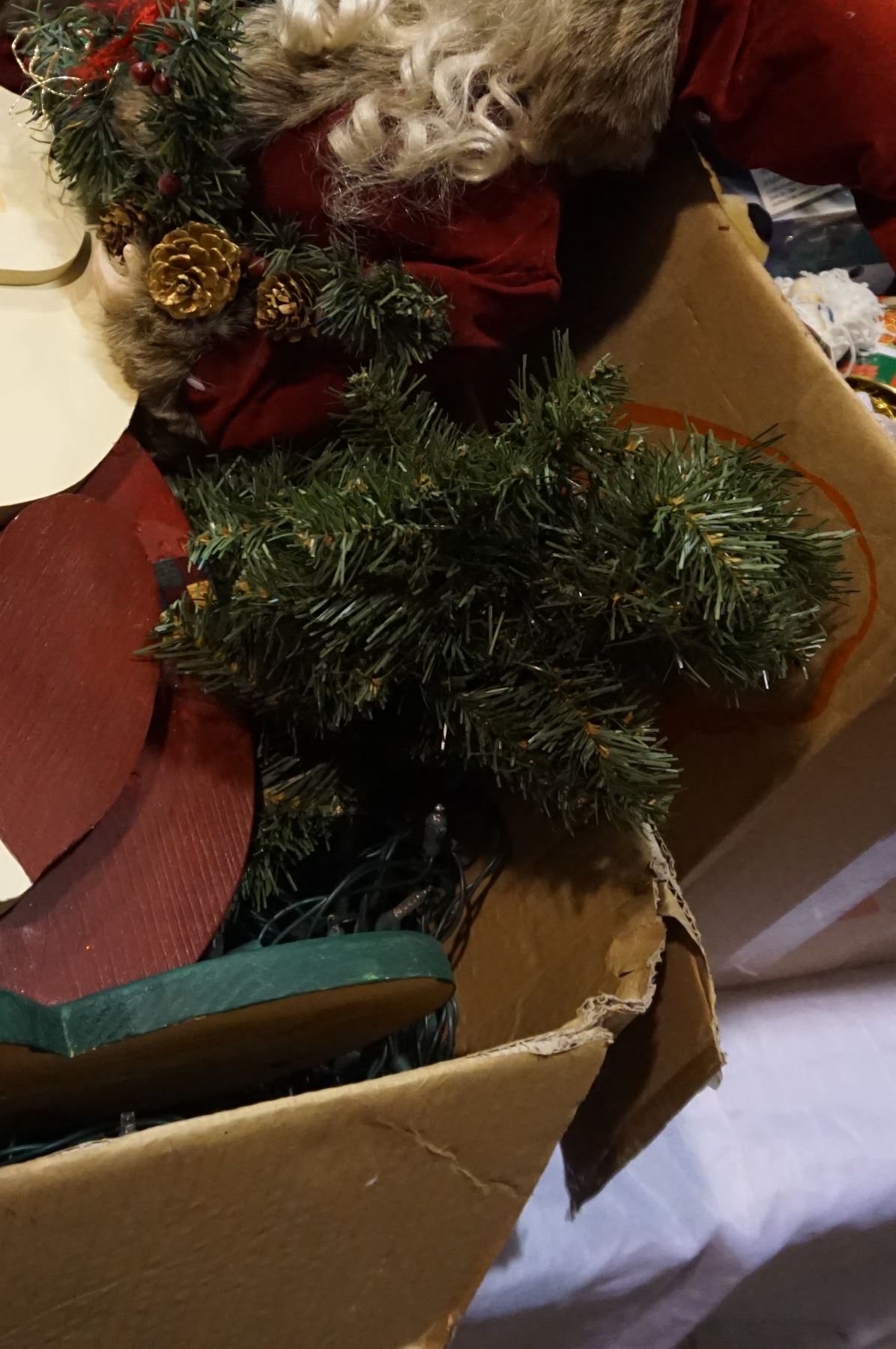 BOX OF XMAS DECOR, SANTA, AND XMAS TREE