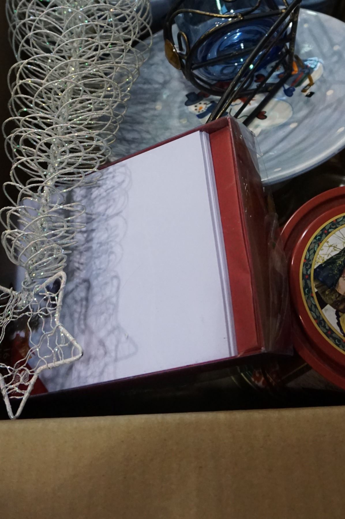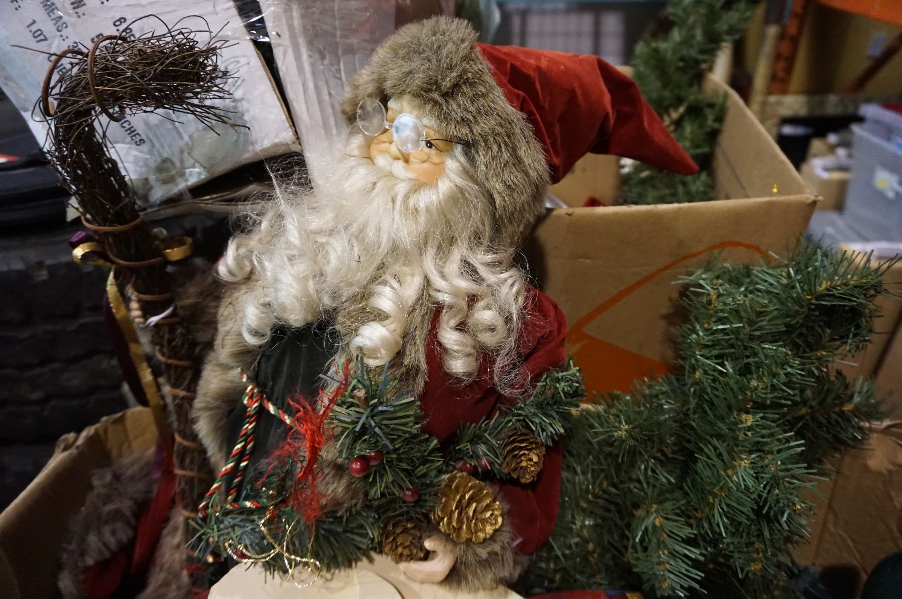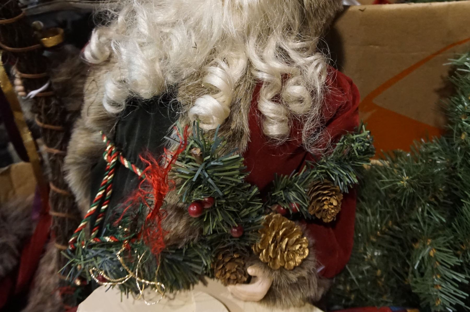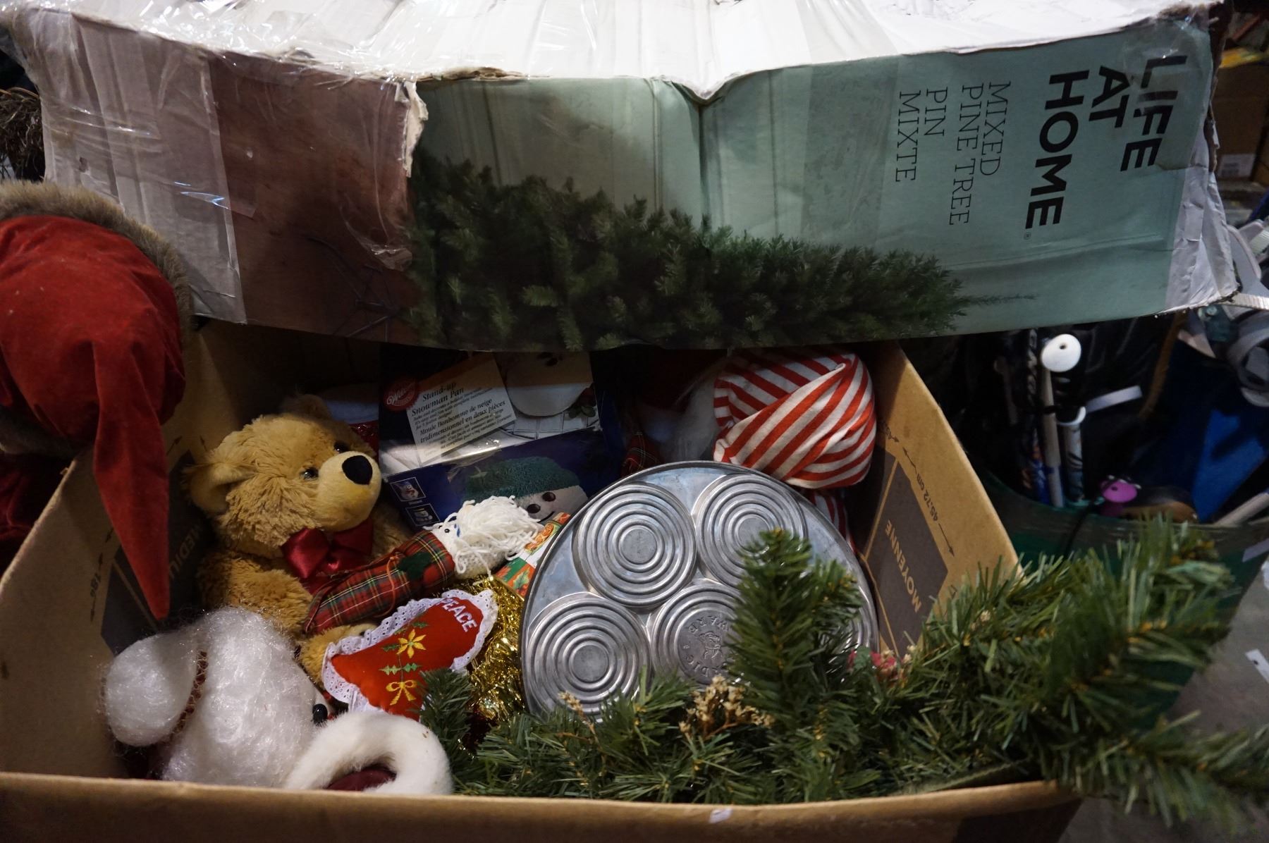 BOX OF XMAS DECOR, SANTA, AND XMAS TREE