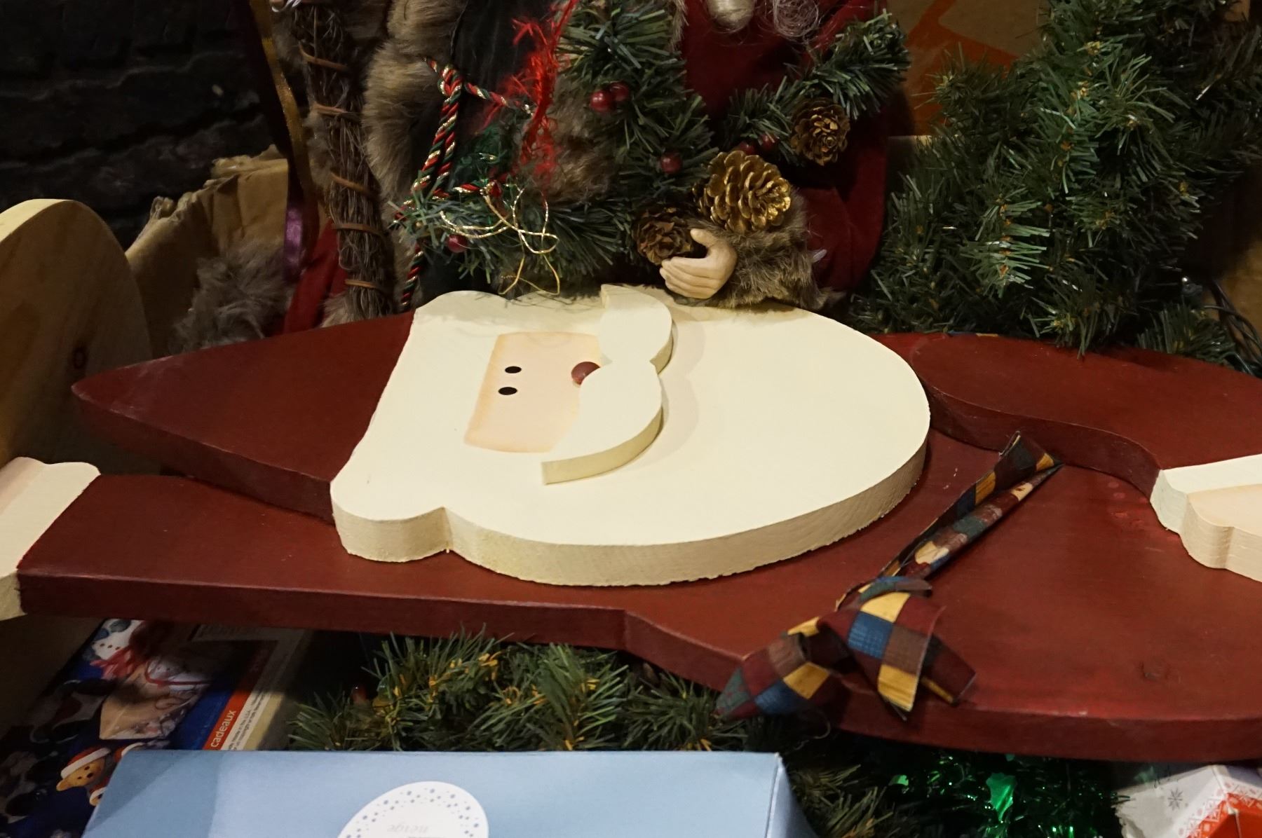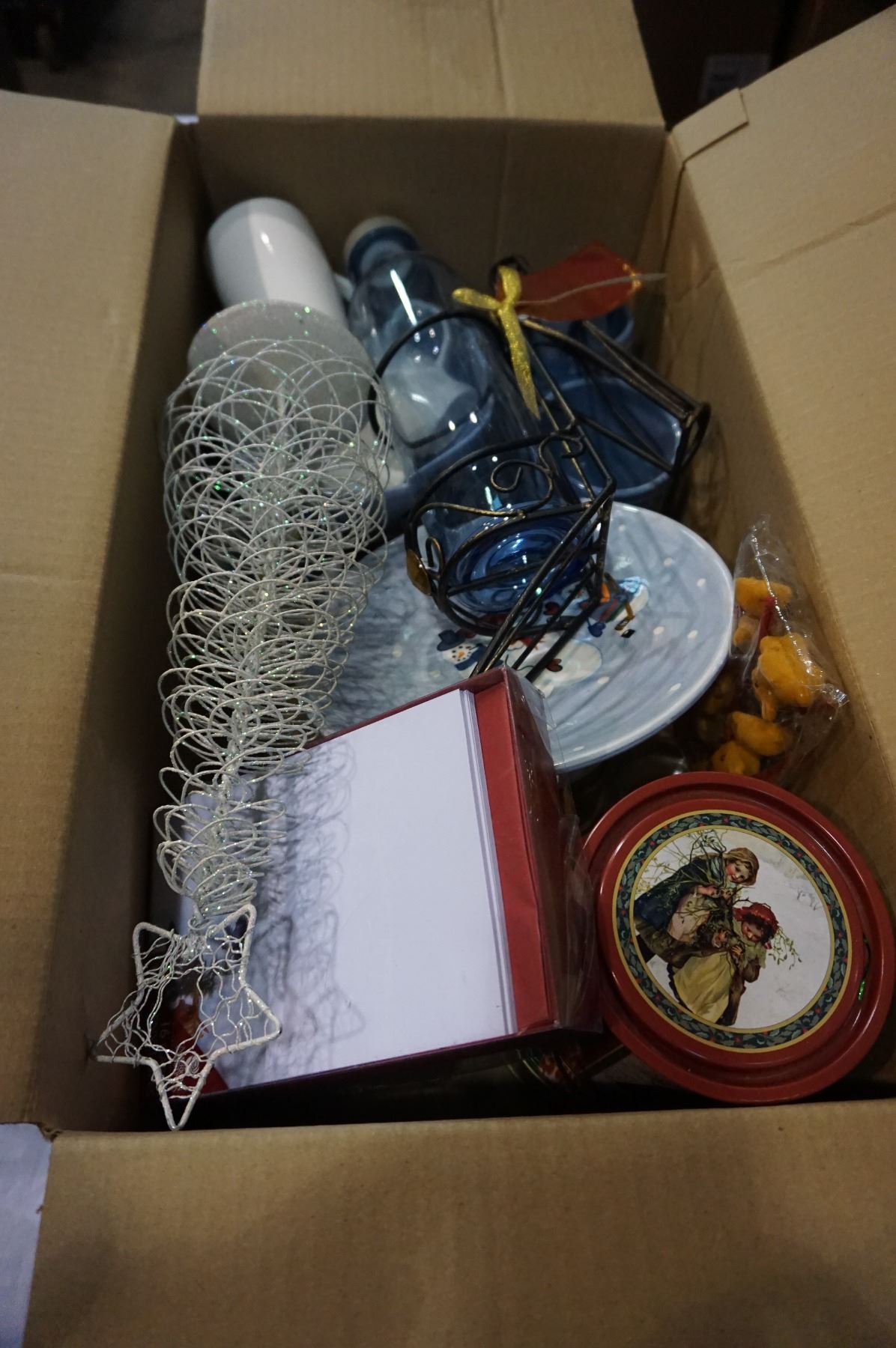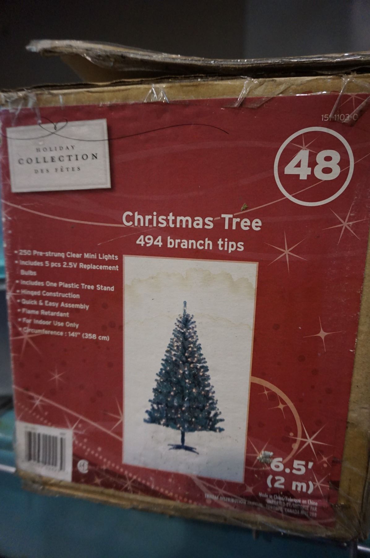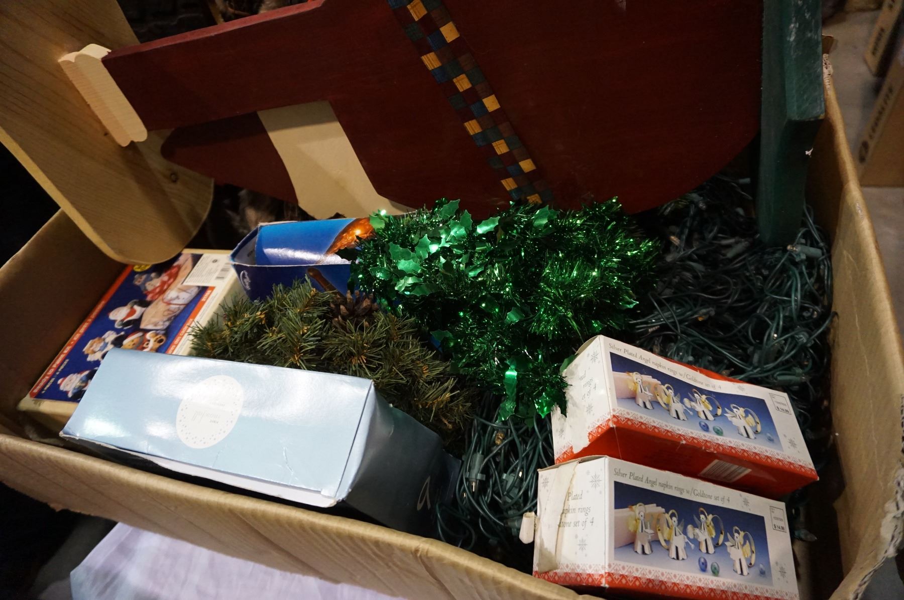 BOX OF XMAS DECOR, SANTA, AND XMAS TREE