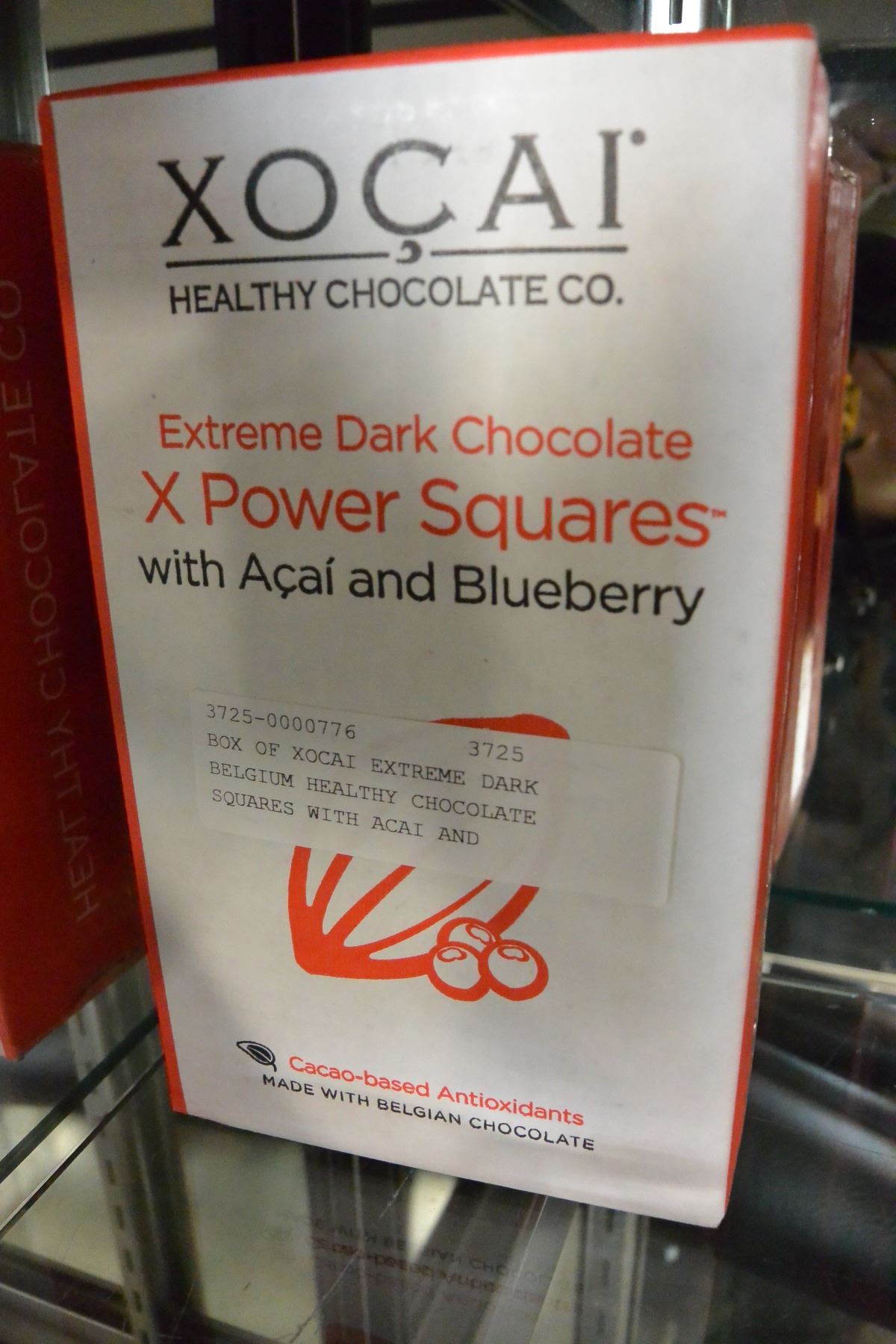 BOX OF XOCAI EXTREME CARK HEALTHY BELGIUM CHOCOLATE SQUARES WITH ACAI AND BLUBERRY 100 PIECES PER BOX RETAIL $150.00 AT COSCO