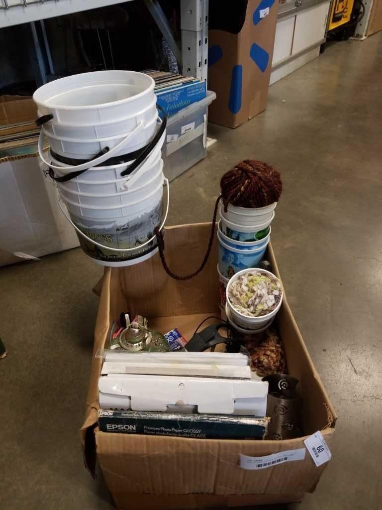 BOX OF YARN, ESTATE GOODS, OIL LAMP