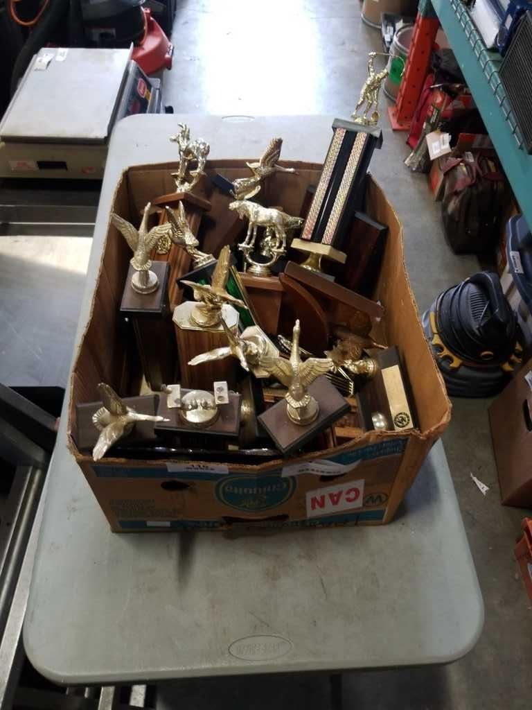 BOX VARIOUS VINTAGE HUNTING AND FISHING TROPHIES