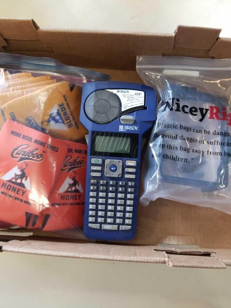 BRADY BMP-21 LABELLER WORKING WITH DRINK COOZIES AND MOUNT
