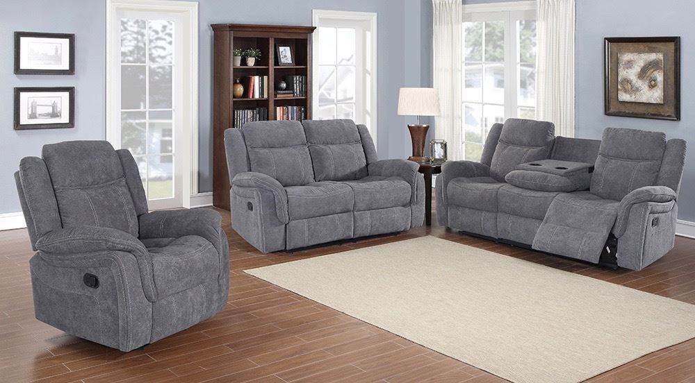 BRAND NEW 3 PIECE GREY FABRIC RECLINING SOFA SET - RETAIL $2299 ROCKER RECLINER, LOVE SEAT, AND SOFA W/ FLIP DOWN CONSOLE