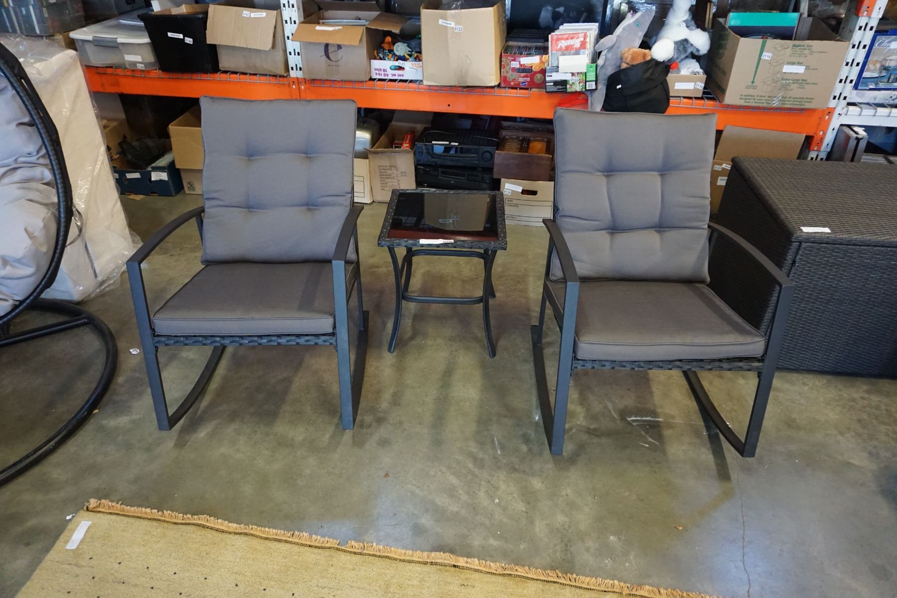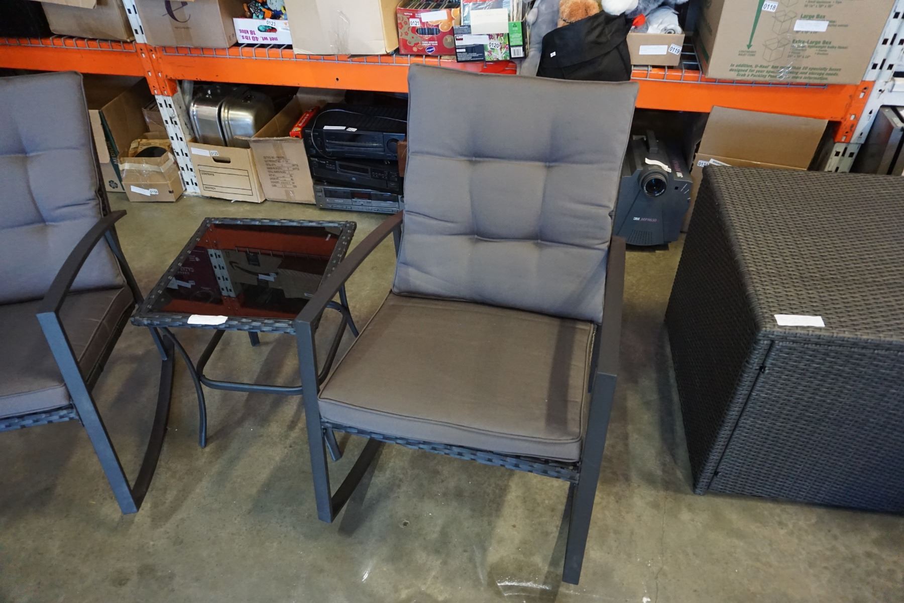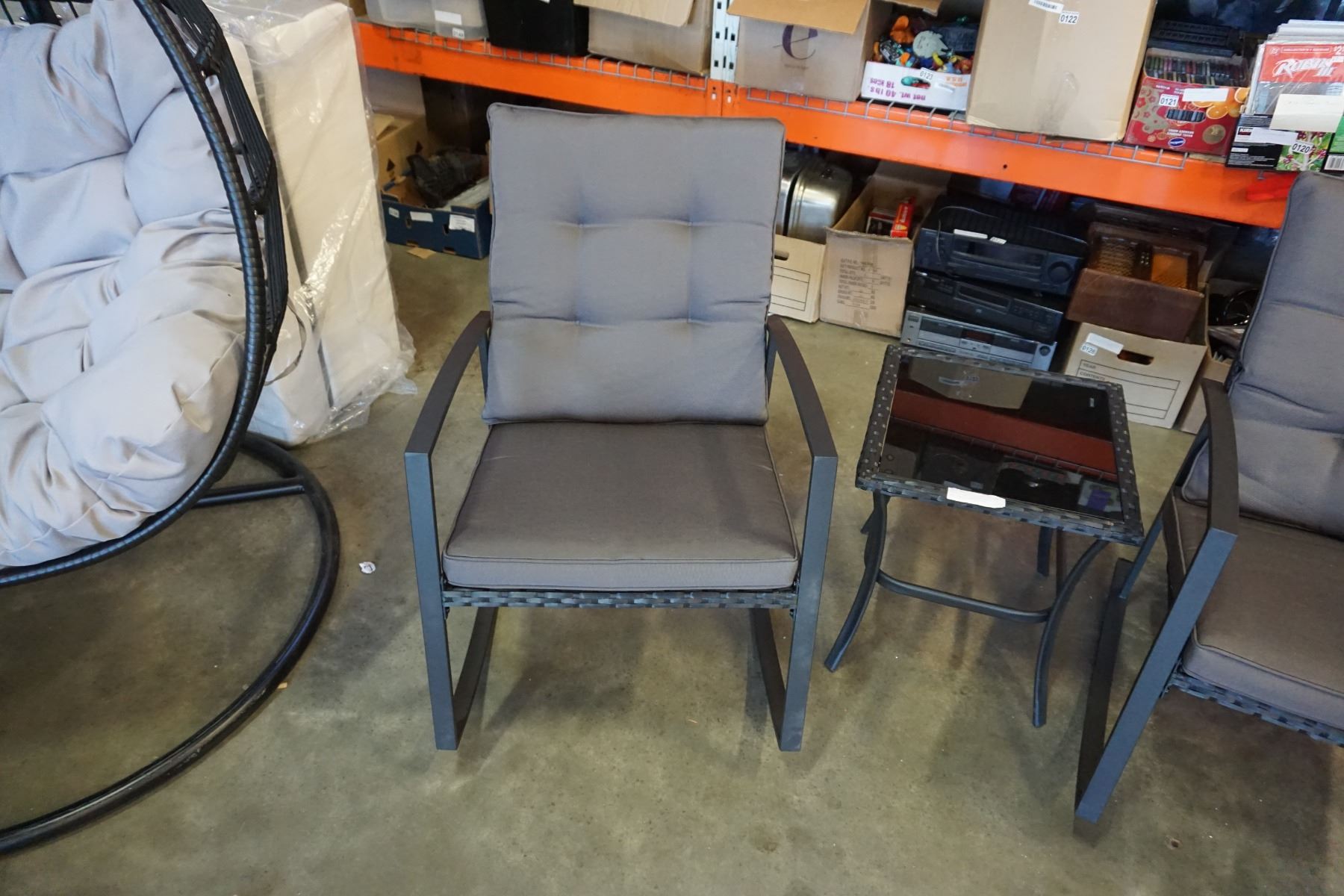BRAND NEW 3 PIECE STEEL WICKER ROCKING CHAIR SET W/ GLASS TOP END TABLE - RETAIL $699