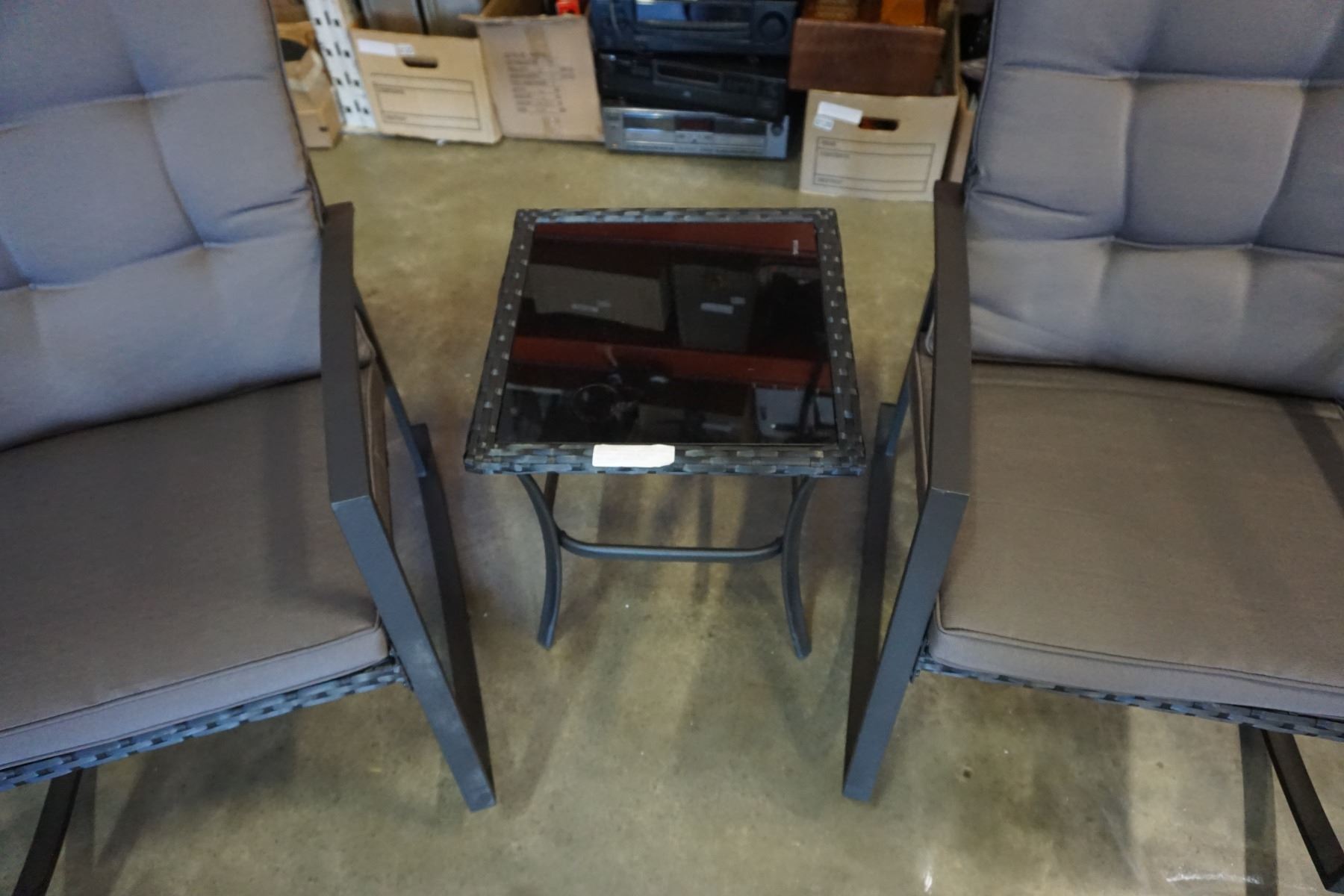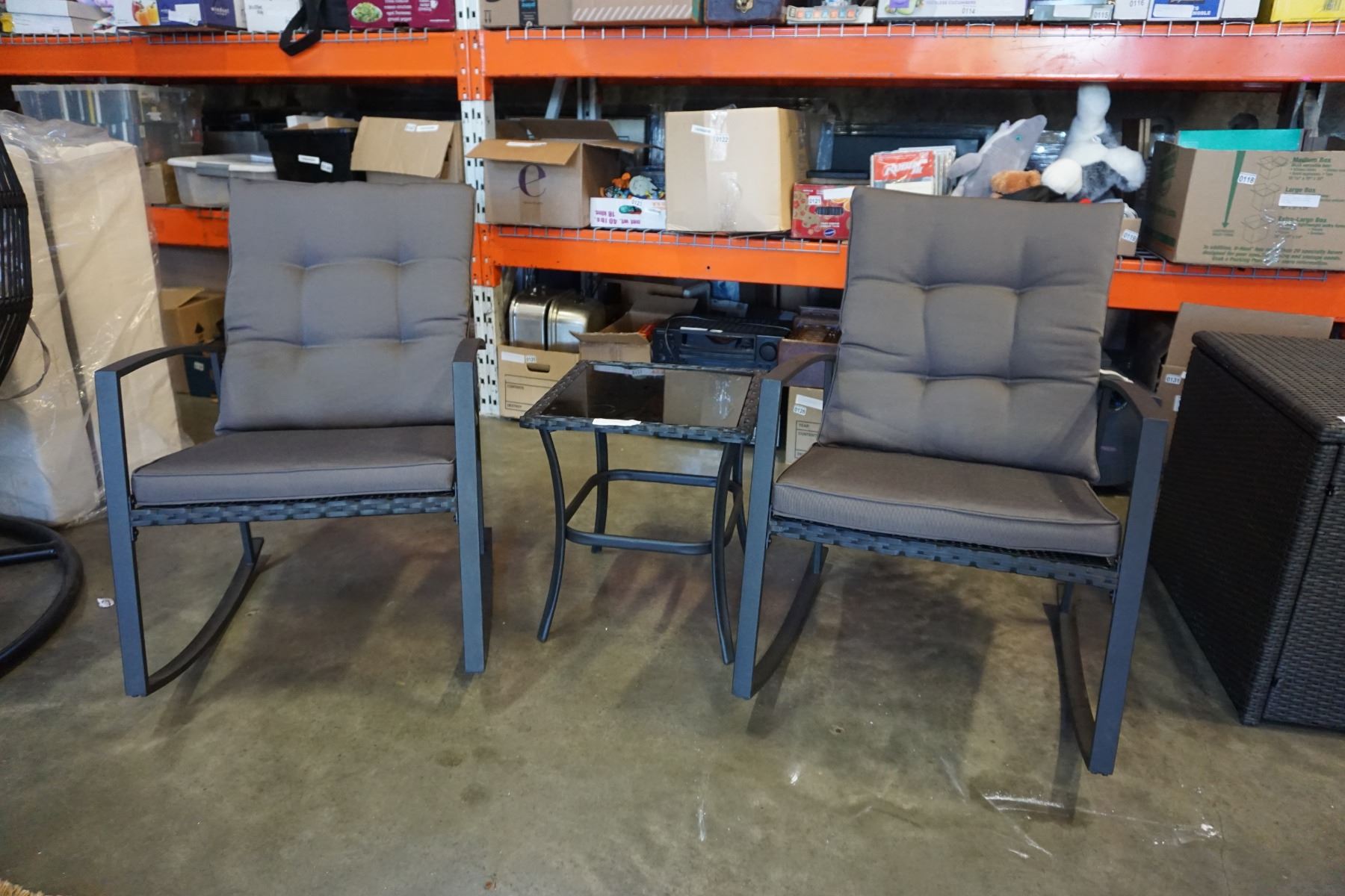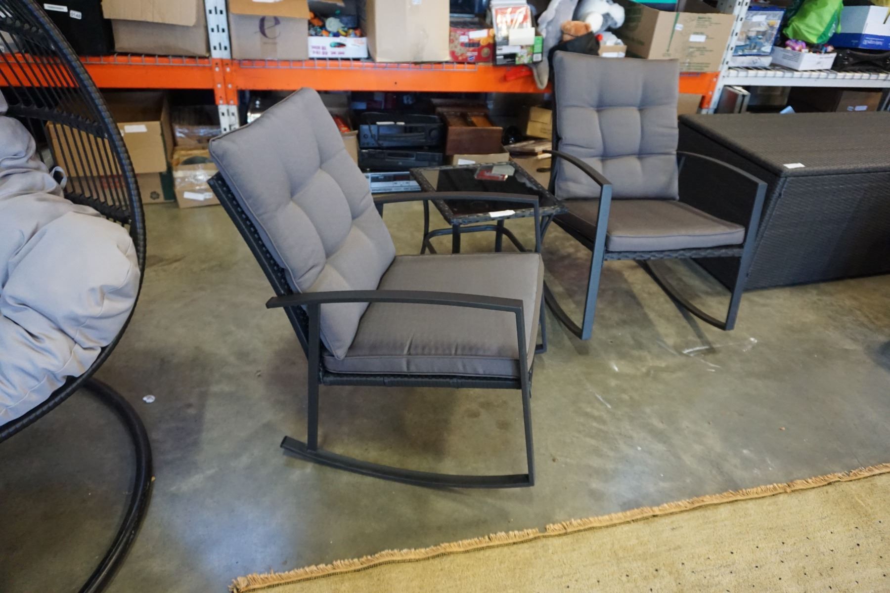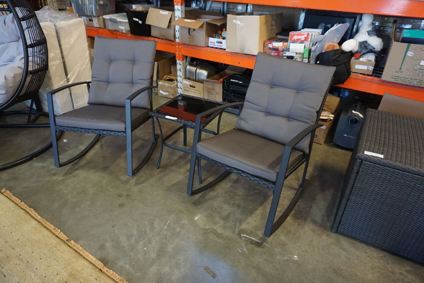 BRAND NEW 3 PIECE STEEL WICKER ROCKING CHAIR SET W/ GLASS TOP END TABLE - RETAIL $699