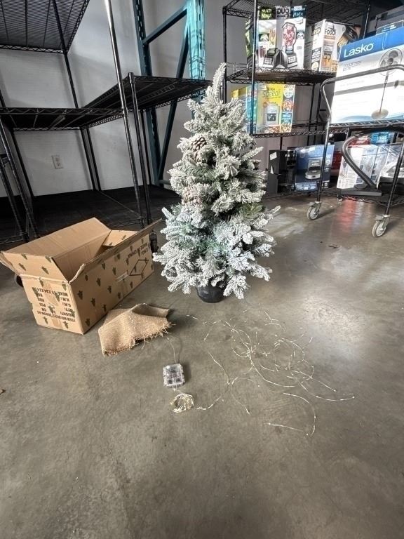 BRAND NEW 40 INCH FLOCKED INDOOR / OUTDOOR CHRISTMAS TREE, IN BLACK POT WITH BURLAP WRAP, AND SET OF LED STRING LIGHTS WITH BATTERY PACK