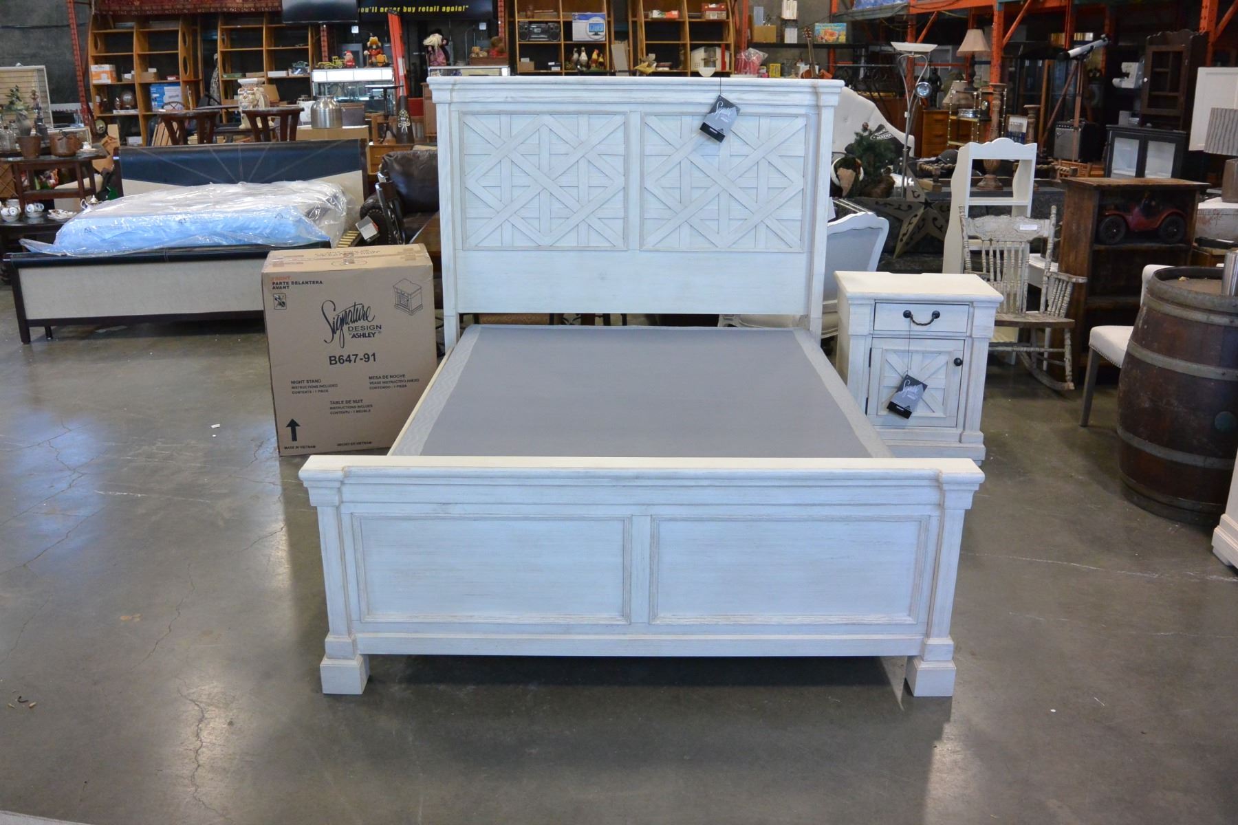 BRAND NEW ASHLEY RUSTIC FARMHOUSE QUEENSIZE PANEL BEDFRAME, 2 NIGHT STANDS WITH POWER/ USB OUTLETS RETAIL $3699