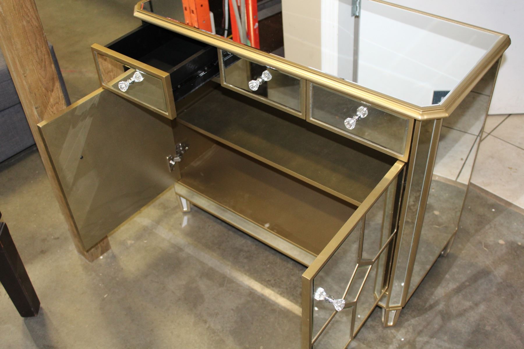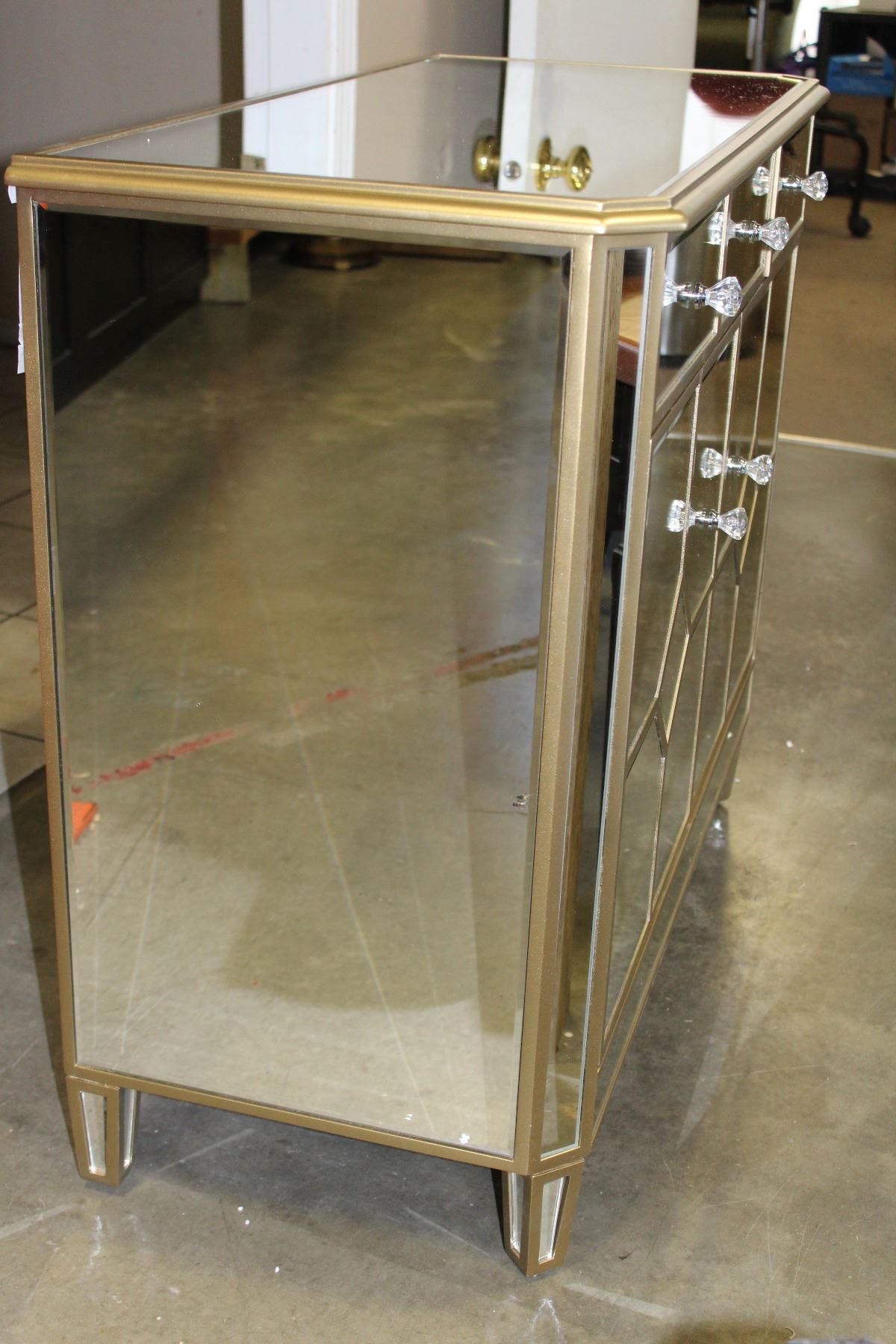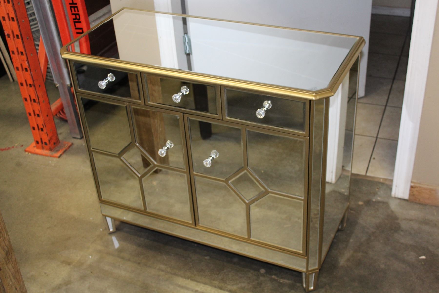 BRAND NEW BEVELLED MIRRORED 3 DRAWER 2 DOOR CABINET WITH CRYSTAL HANDLES