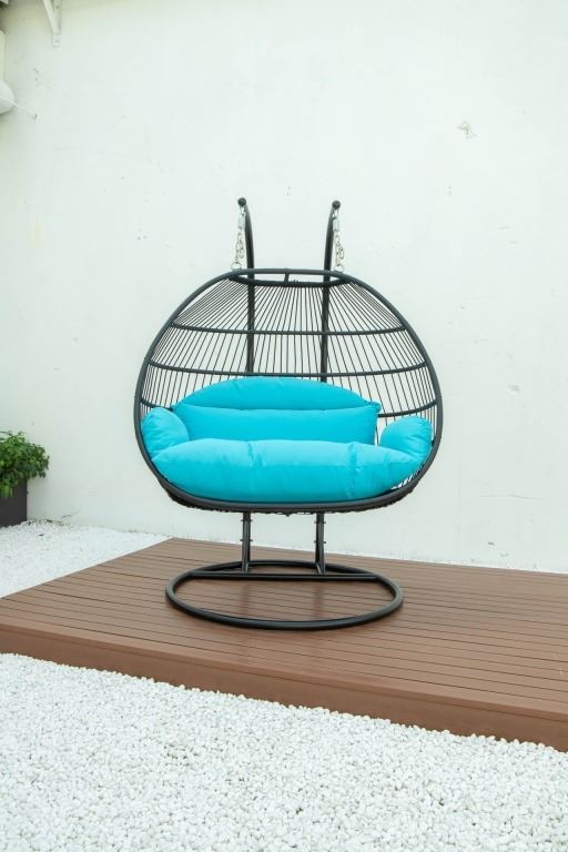 BRAND NEW BLUE DOUBLE HANGING EGG CHAIR - RETAIL $1969 W/ FOLDABLE FRAME, POWDER COATED STEEL FRAME,