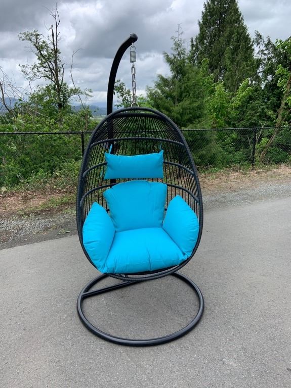 BRAND NEW BLUE SINGLE HANGING EGG CHAIR - RETAIL $949 W/ NECK PILLOW, FOLDABLE FRAME, POWDER COATED