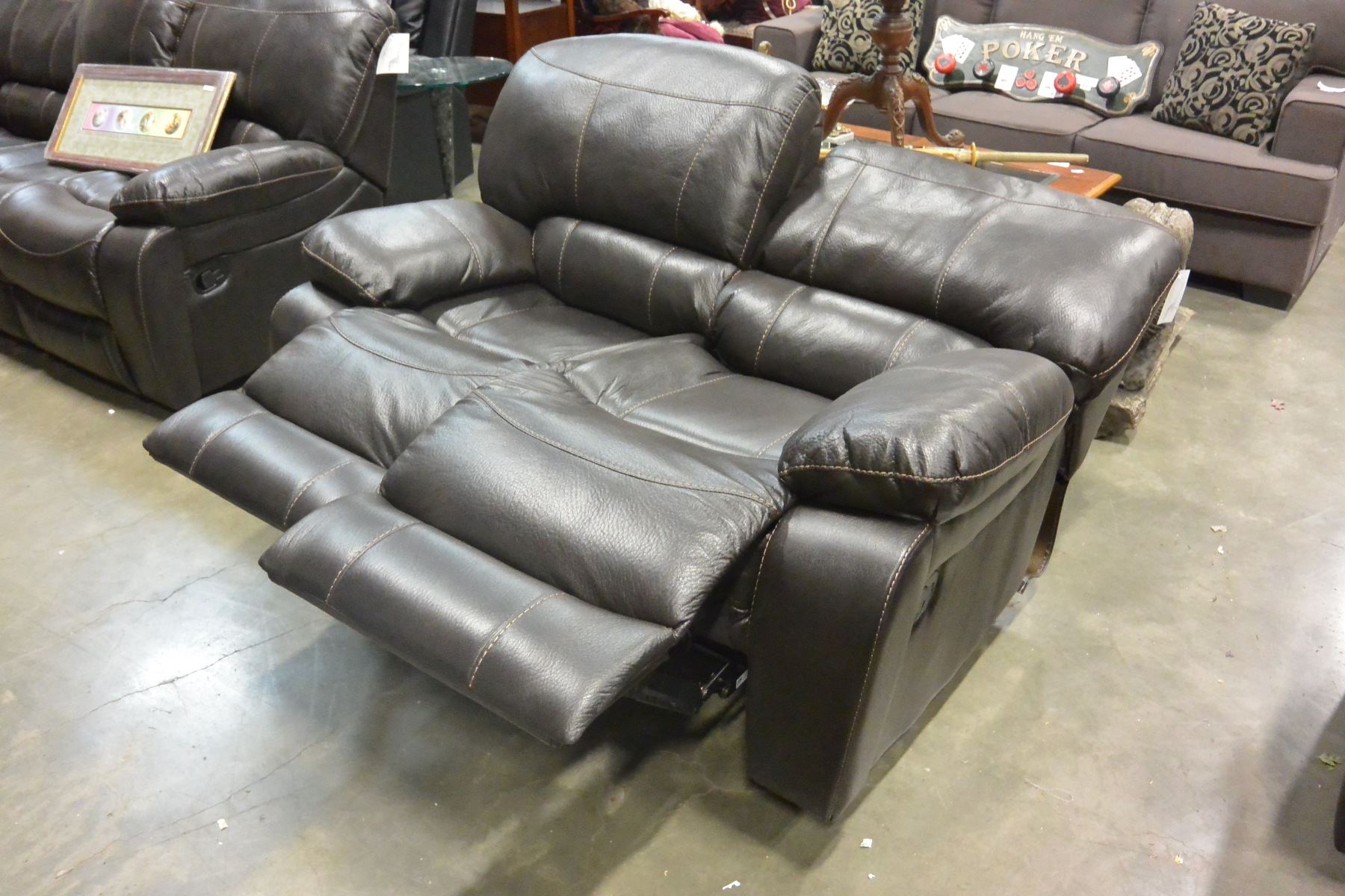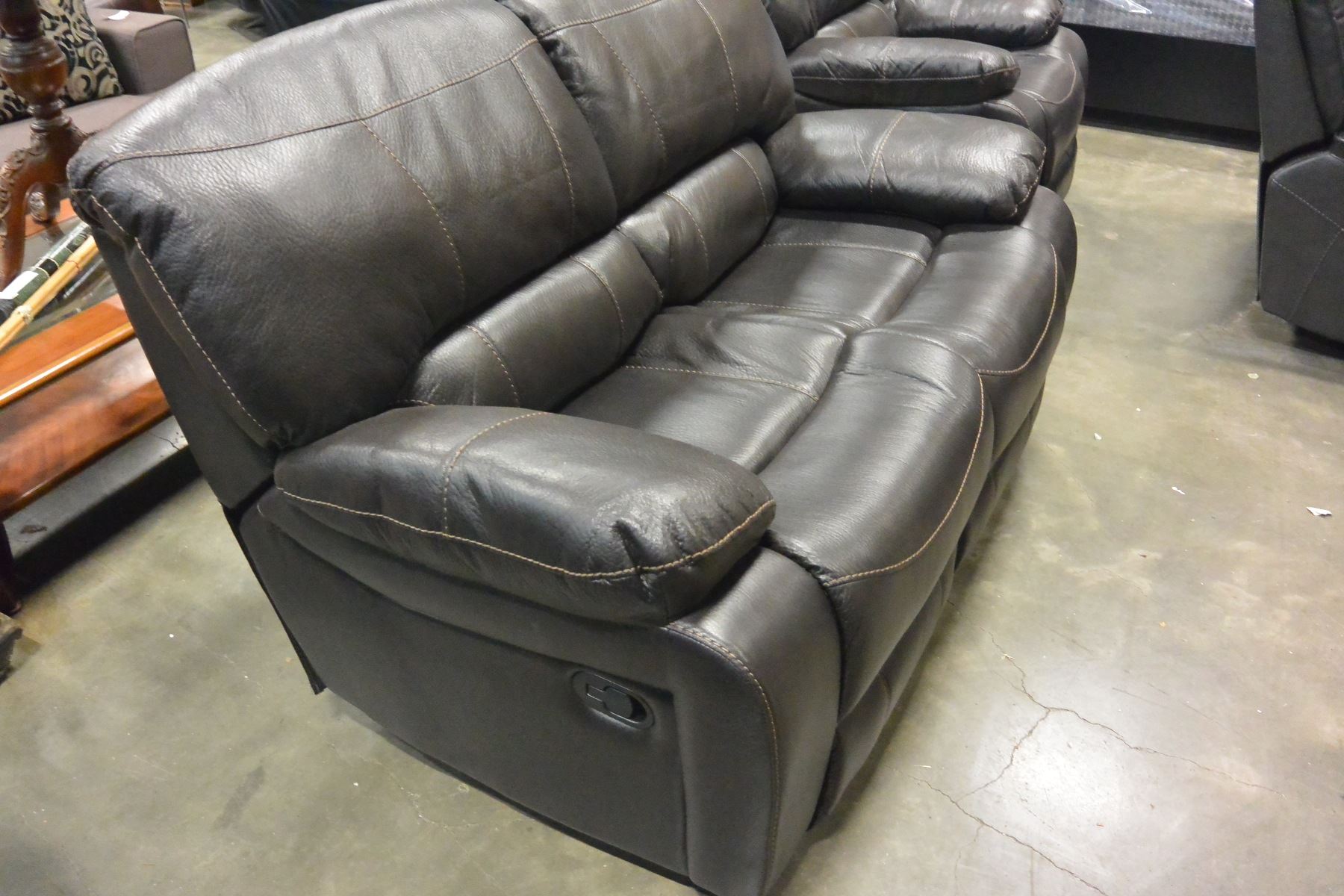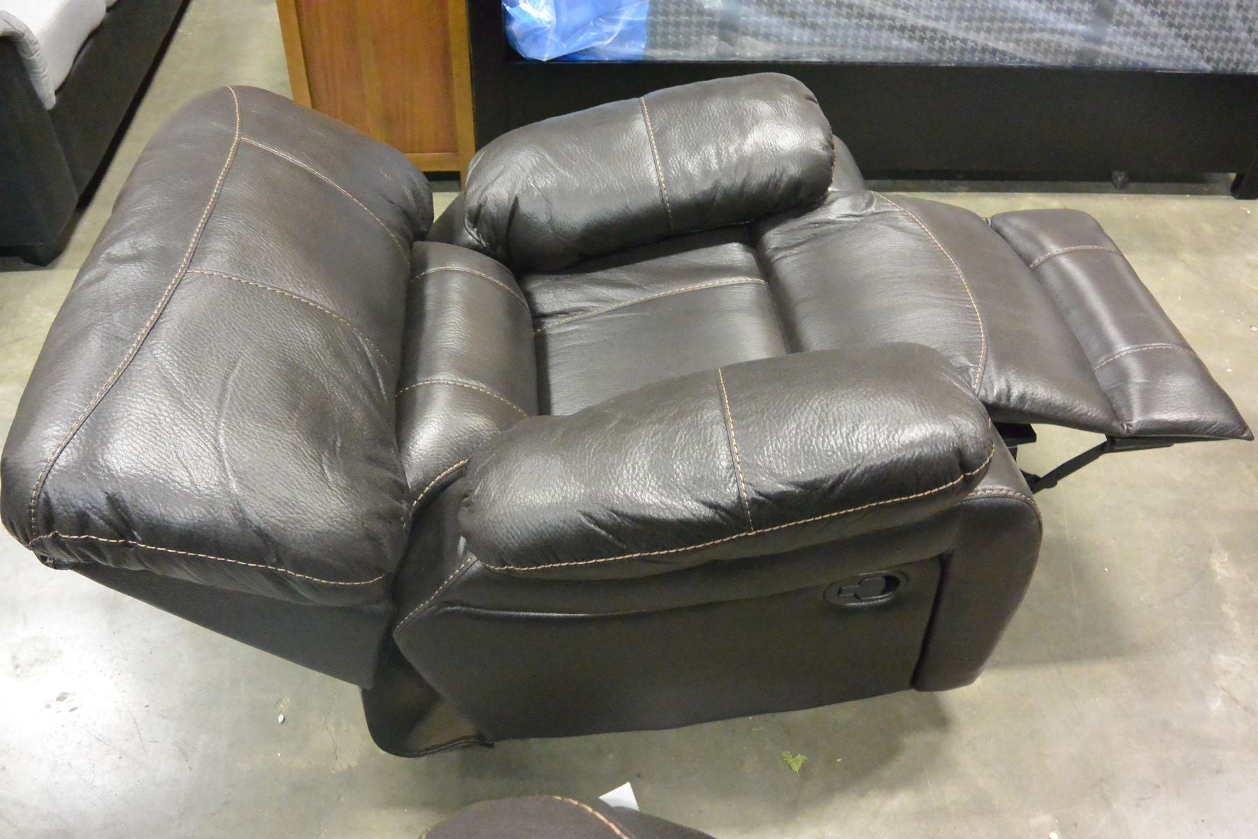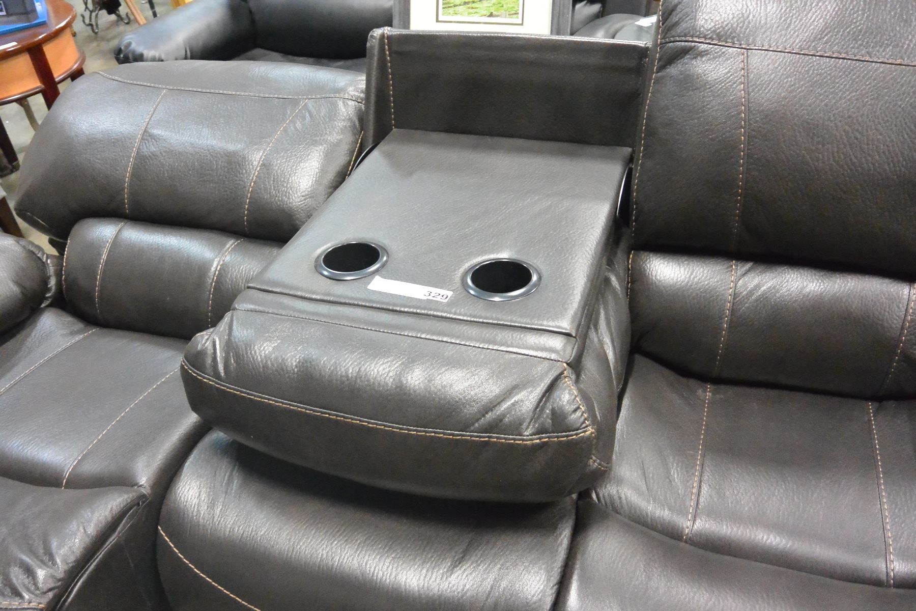 BRAND NEW BROWN PALOMINO FABRIC SOFA SET, WITH COUNTOURED MEMORY FOAM SEATS, WHITE BROWN STITCHING, AND DROP DOWN SOFA TABLE, ROCKING RECLINER RETAIL $5399