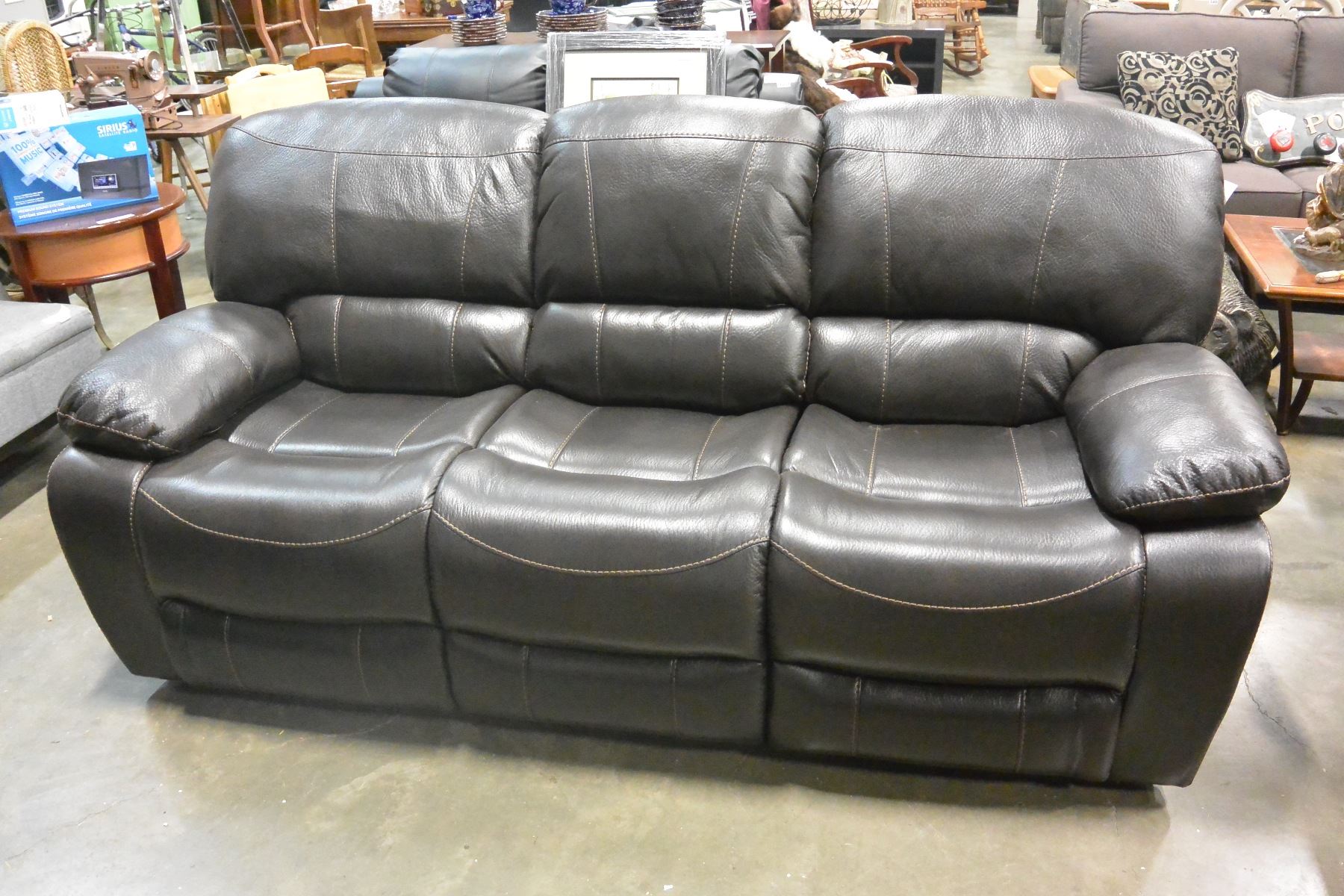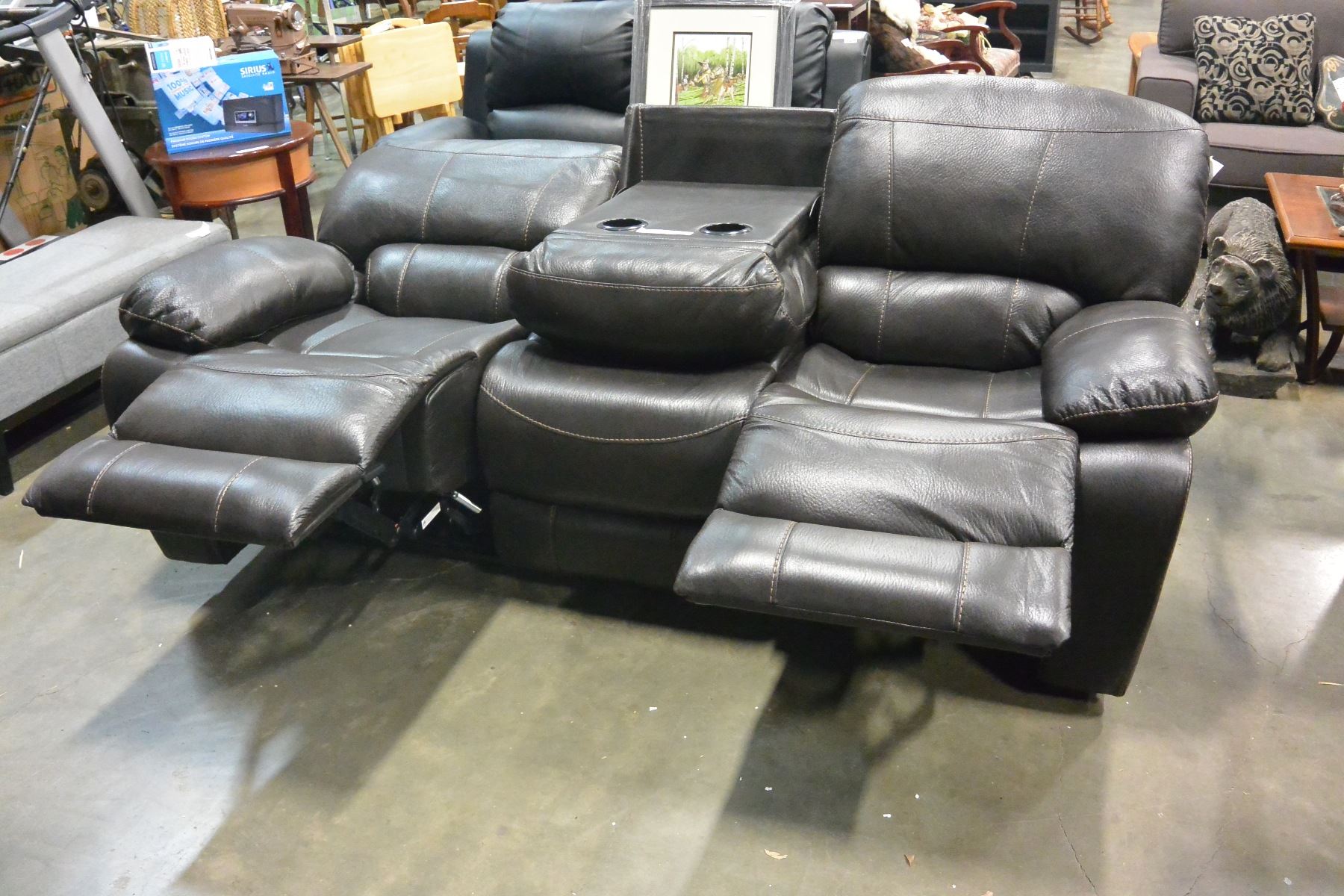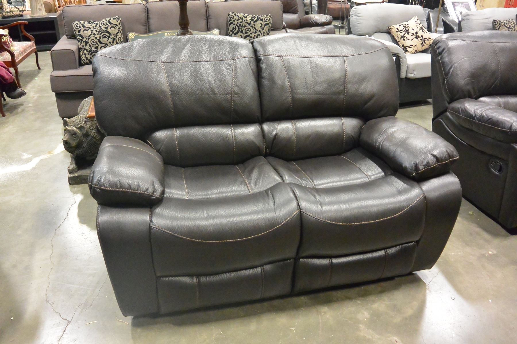 BRAND NEW BROWN PALOMINO FABRIC SOFA SET, WITH COUNTOURED MEMORY FOAM SEATS, WHITE BROWN STITCHING, AND DROP DOWN SOFA TABLE, ROCKING RECLINER RETAIL $5399