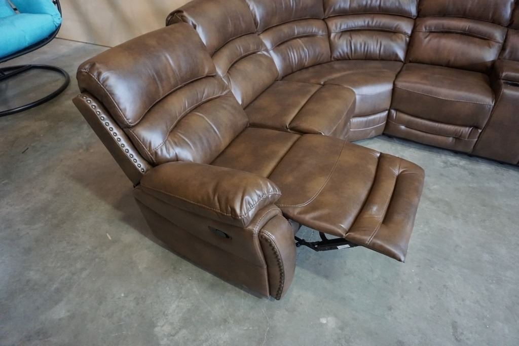 BRAND NEW BROWN STITCHED LEATHER 3PC CORNER RECLINING SECTIONAL W/ CONSOLE, CUP HOLDERS AND BRASS NA
