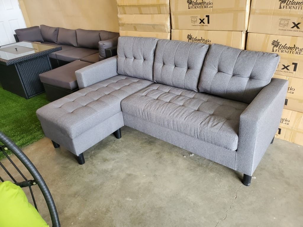 BRAND NEW CHARCOAL GREY COTTEN LINEN TUFTED REVERSIBLE SECTIONAL - RETAIL $899