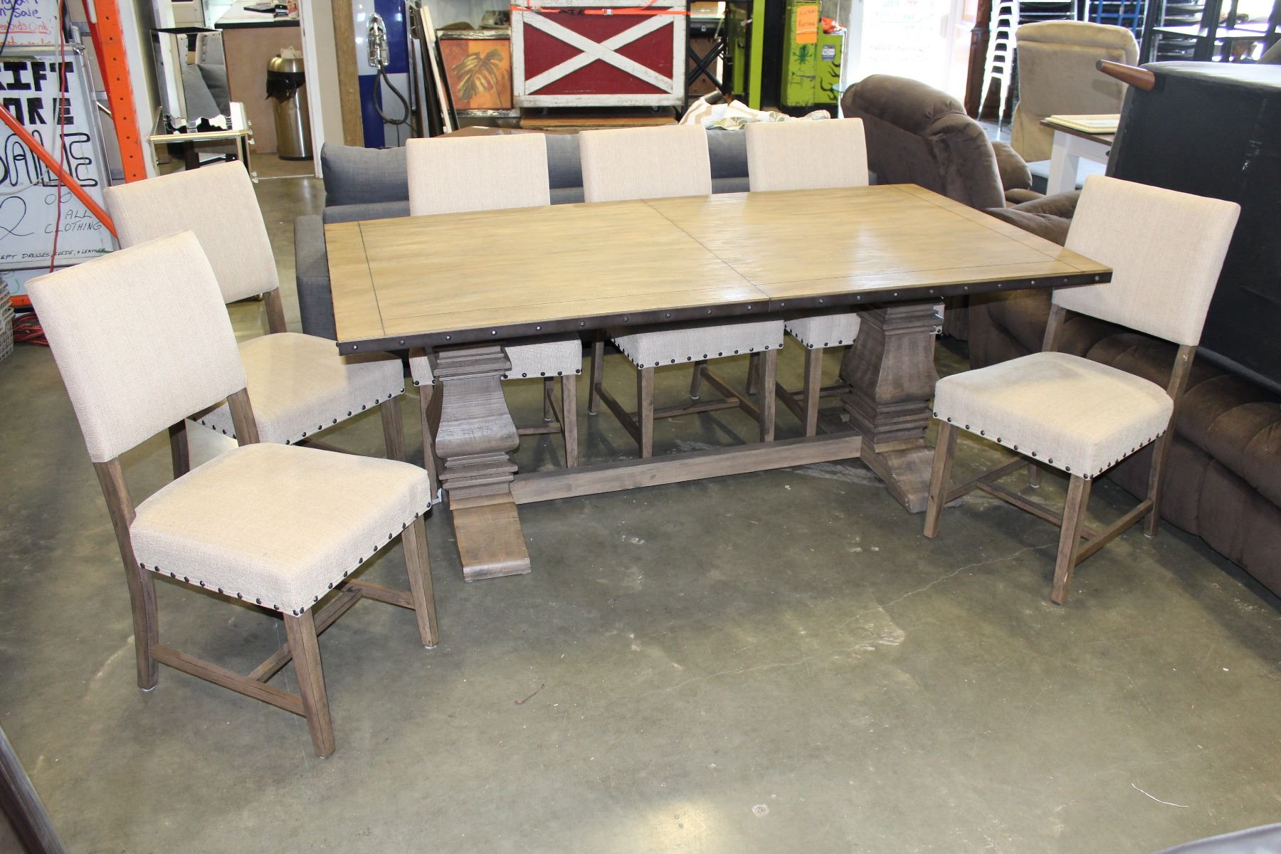 BRAND NEW FLOOR MODEL MAZZIN HOME ELEGANCE RUSTIC STYLE TRESTLE BASE DINING TABLE AND TWO LEAFS AND 6 UPOLSTERED CHAIR