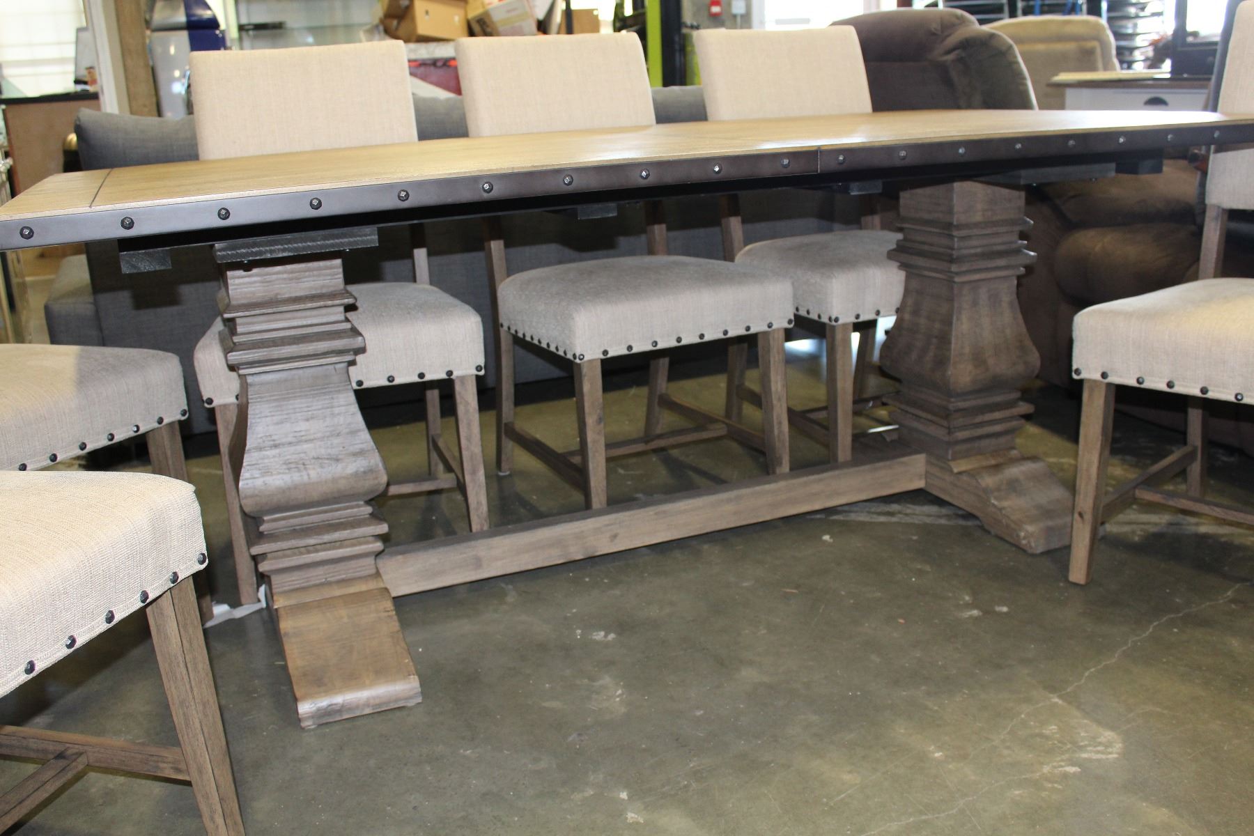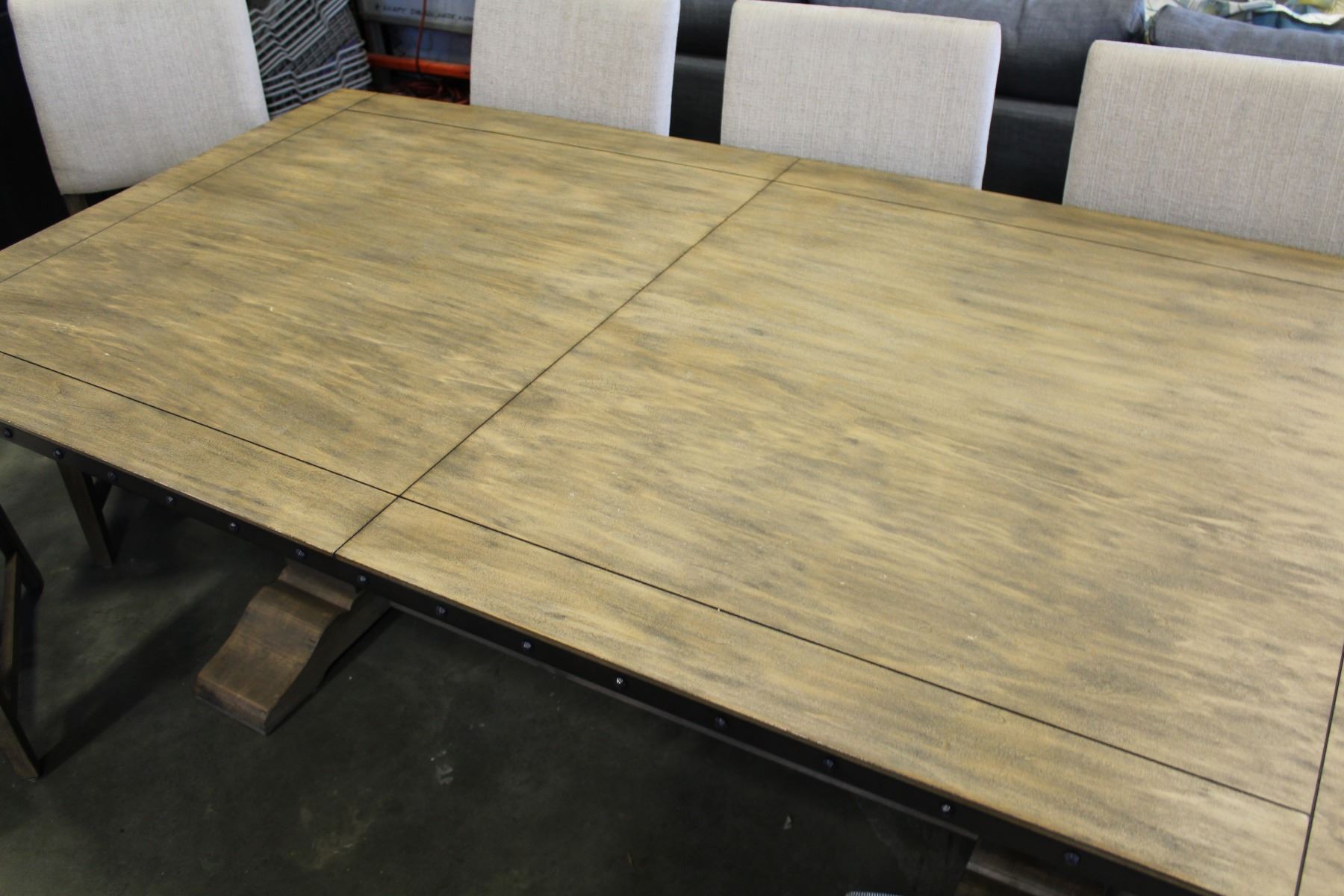 BRAND NEW FLOOR MODEL MAZZIN HOME ELEGANCE RUSTIC STYLE TRESTLE BASE DINING TABLE AND TWO LEAFS AND