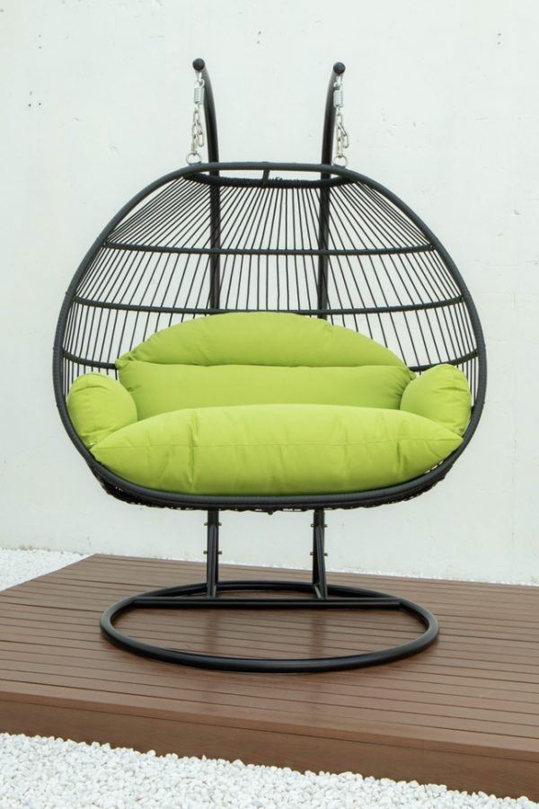 BRAND NEW GREEN CUSHION DOUBLE HANGING EGG CHAIR - RETAIL $1969 W/ FOLDABLE FRAME, POWDER COATED STE