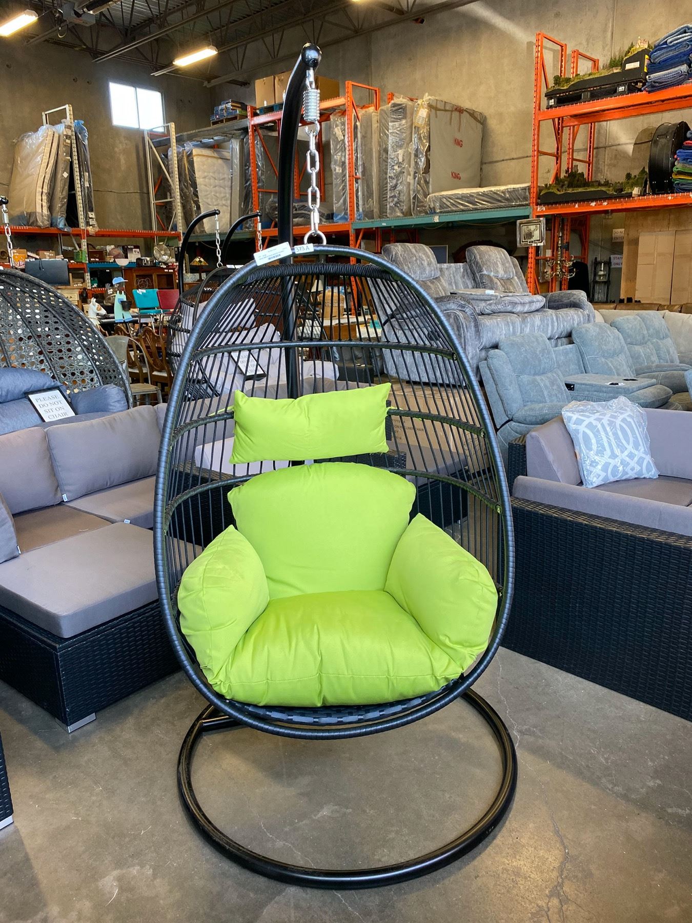 BRAND NEW GREEN CUSHION HANGING EGG CHAIR - RETAIL $949 W/ NECK PILLOW, FOLDABLE FRAME, POWDER COATE