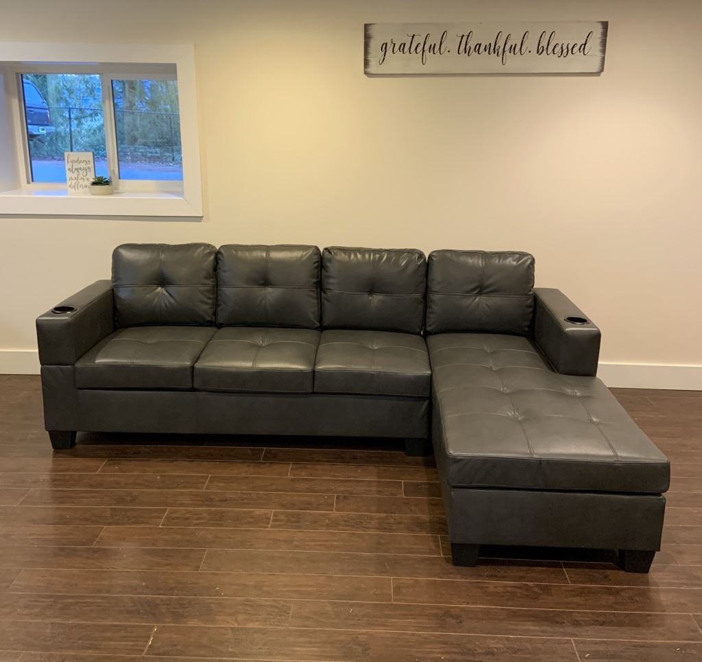 BRAND NEW GREY AIR LEATHER 2 PC SECTIONAL SOFA W/ CUPHOLDERS, AND REMOVABLE PILLOW BACKS, RETAIL $13