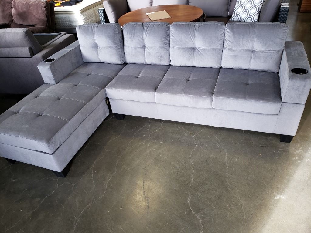 BRAND NEW GREY FABRIC 2 PC SECTIONAL SOFA WITH CUPHOLDERS, AND REMOVABLE PILLOW BACKS, RETAIL $1299 95 INCHES WIDE, BY 60 DEEP CHAISE