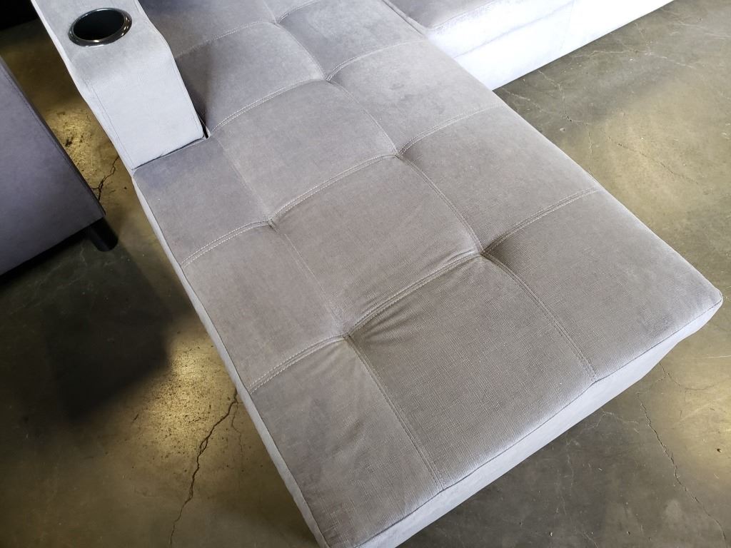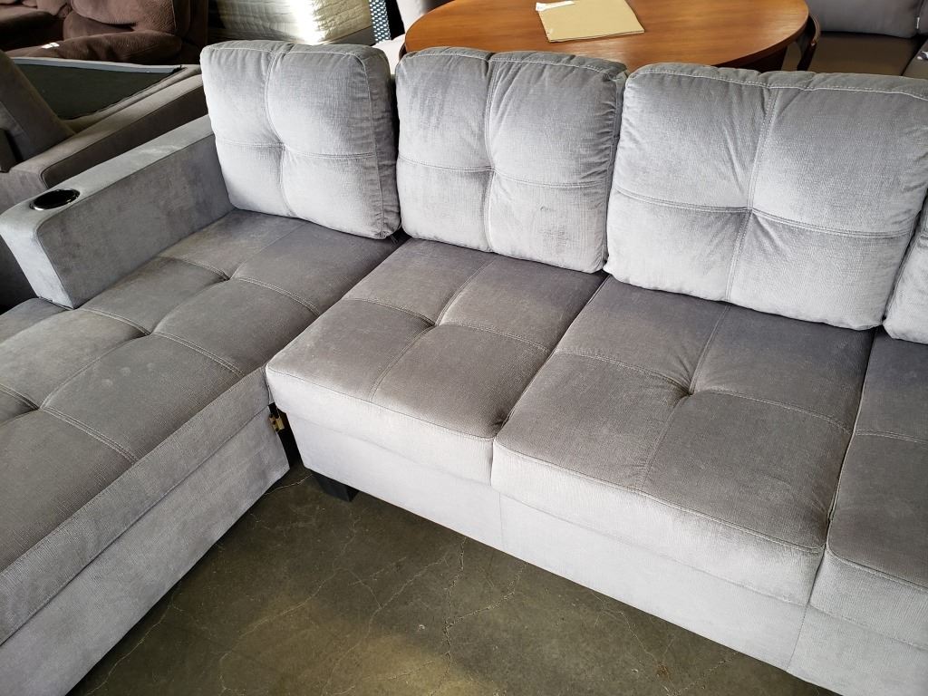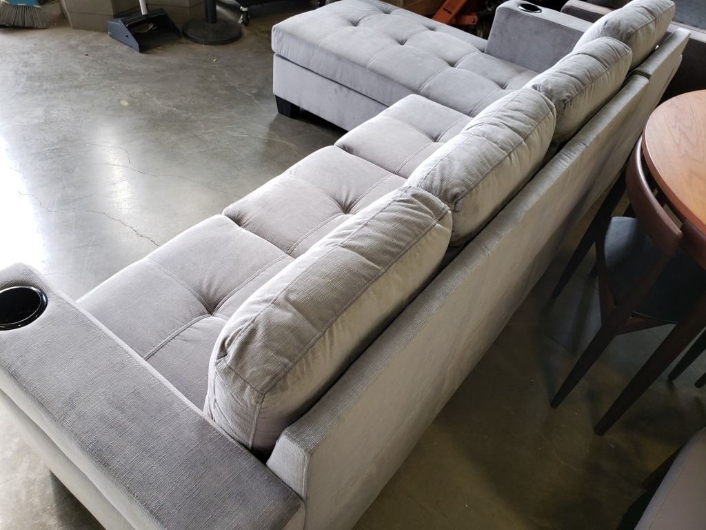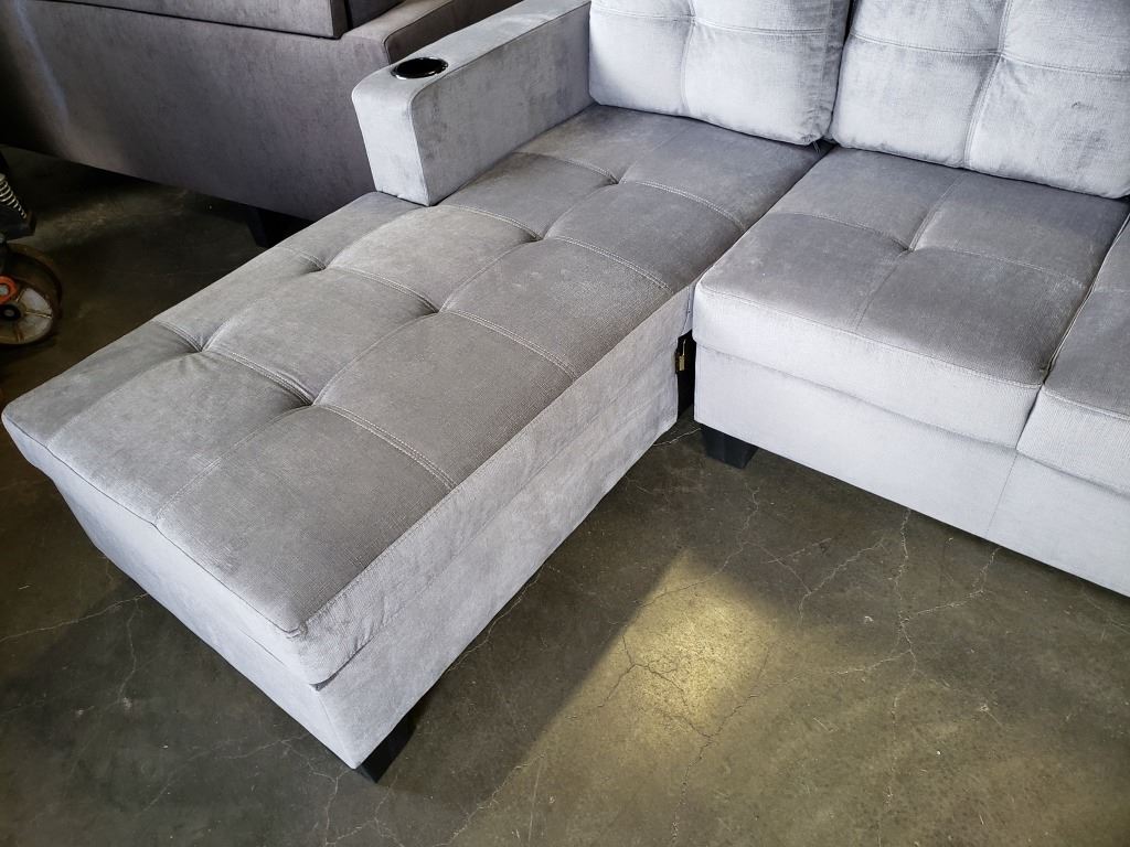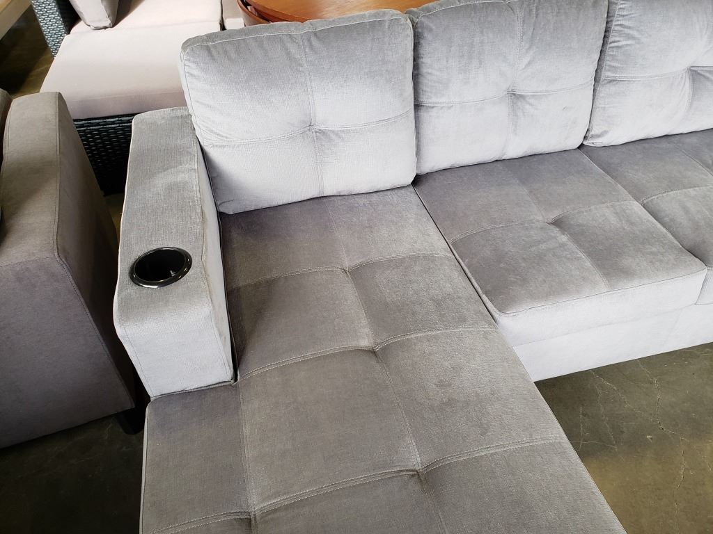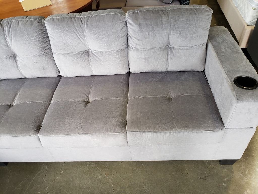 BRAND NEW GREY FABRIC 2 PC SECTIONAL SOFA WITH CUPHOLDERS, AND REMOVABLE PILLOW BACKS, RETAIL $1299 95 INCHES WIDE, BY 60 DEEP CHAISE