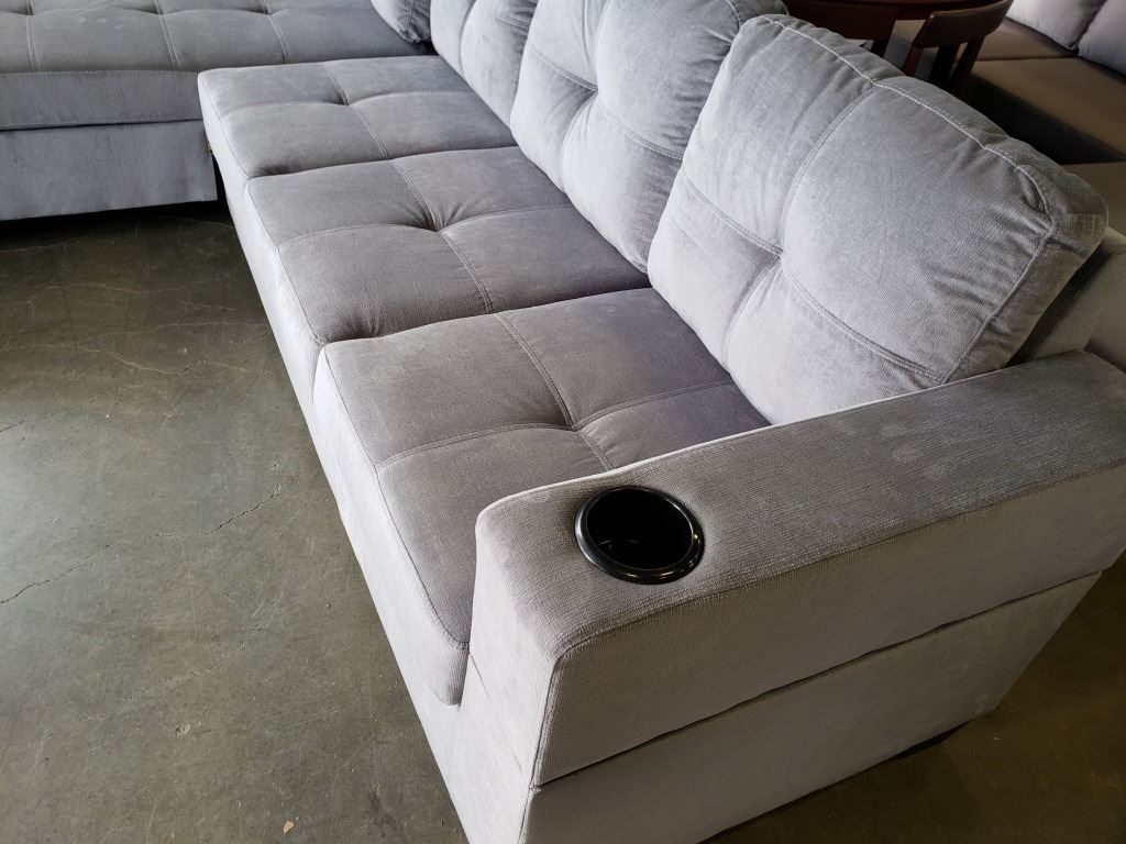 BRAND NEW GREY FABRIC 2 PC SECTIONAL SOFA WITH CUPHOLDERS, AND REMOVABLE PILLOW BACKS, RETAIL $1299