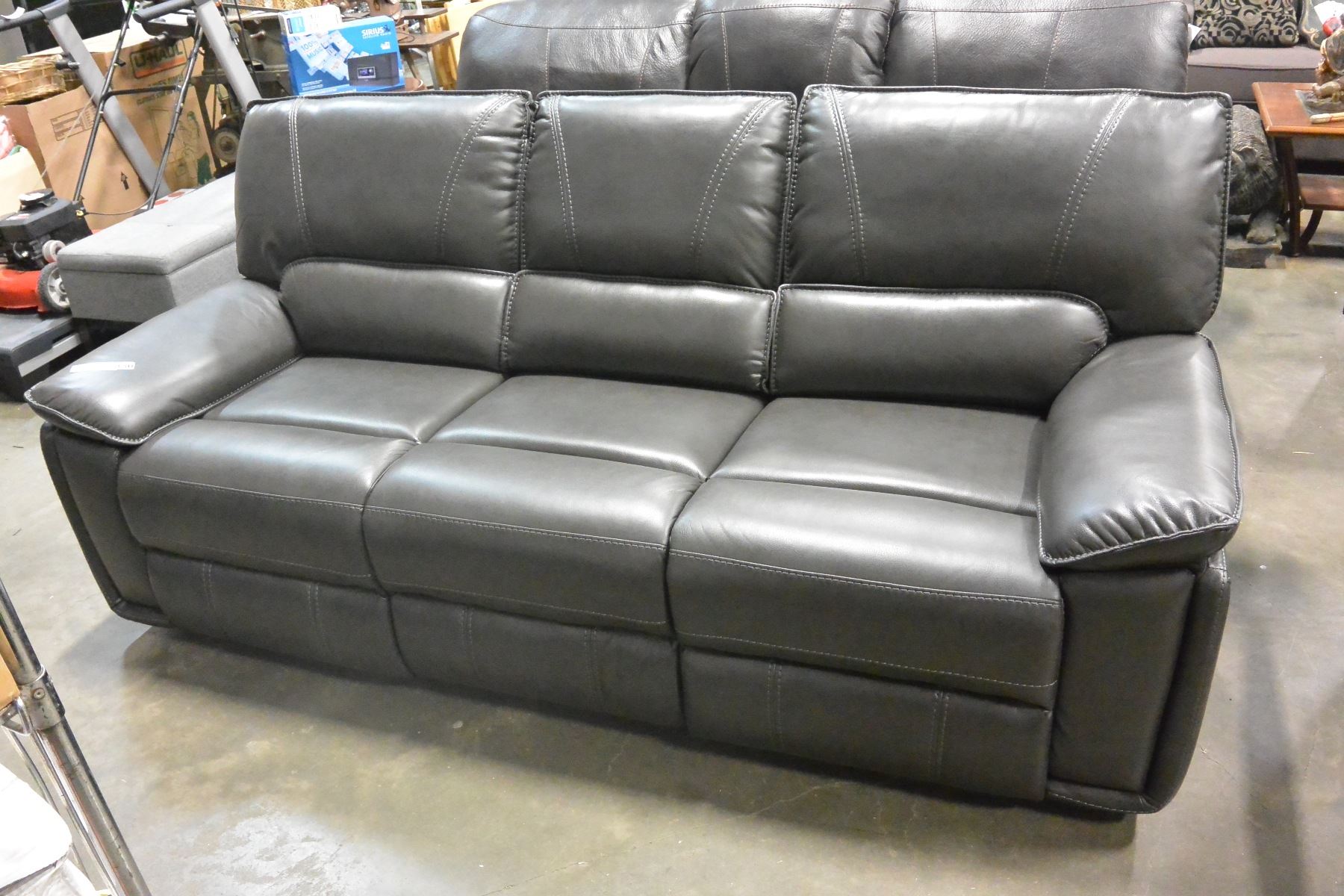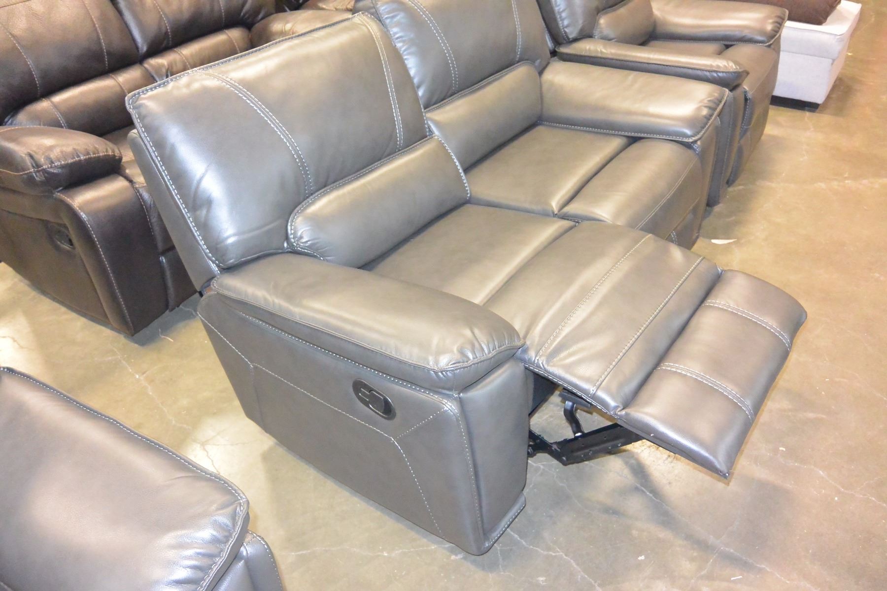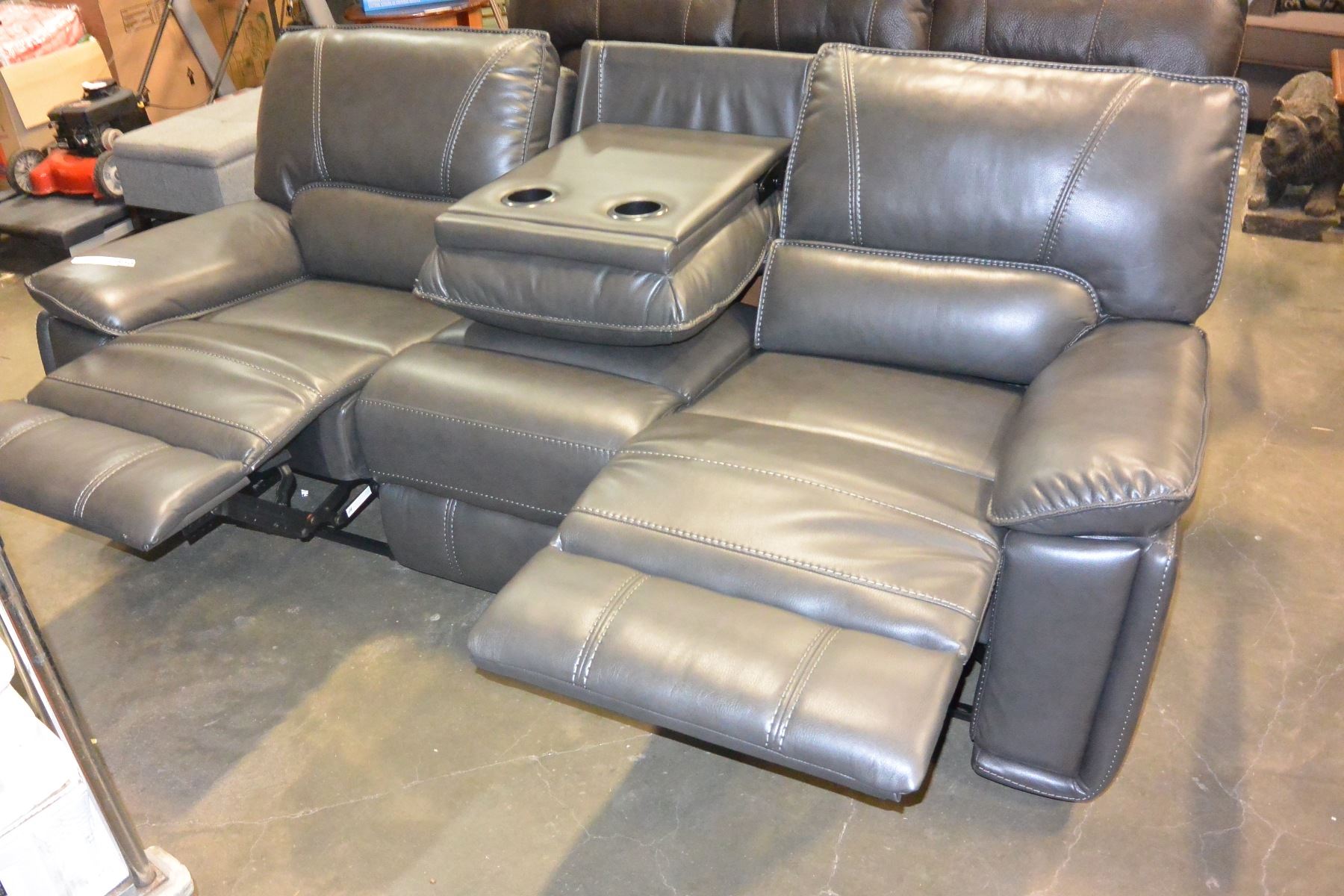 BRAND NEW GREY LEATHER WITH WHITE STITCHING MODERN 3 PIECE SOFA SET, WITH DROP DOWN SOFA TABLE, RECL